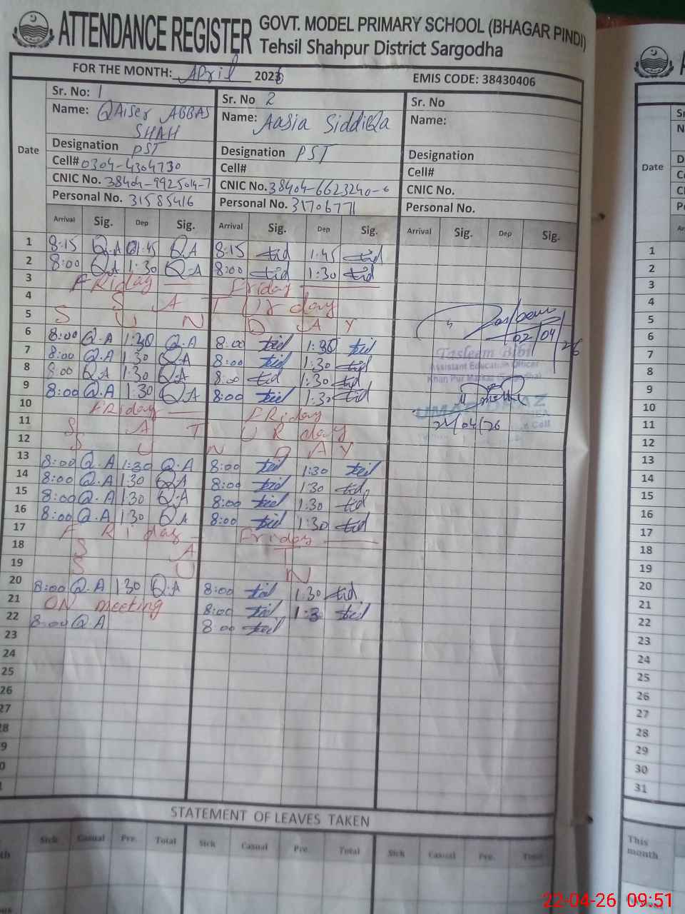 | Name: QA**** AB**** SH**** Designation: (School Headmaster's/Headmistress's) PST Phone/Cell Number: 03**** |