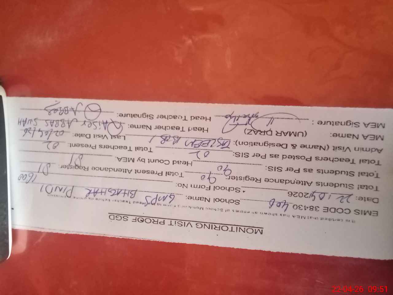 | Certified that this School was Inspected by the Undersigned MEA/DMO Today and the Information Stated Above is as Per Record. | |||||
