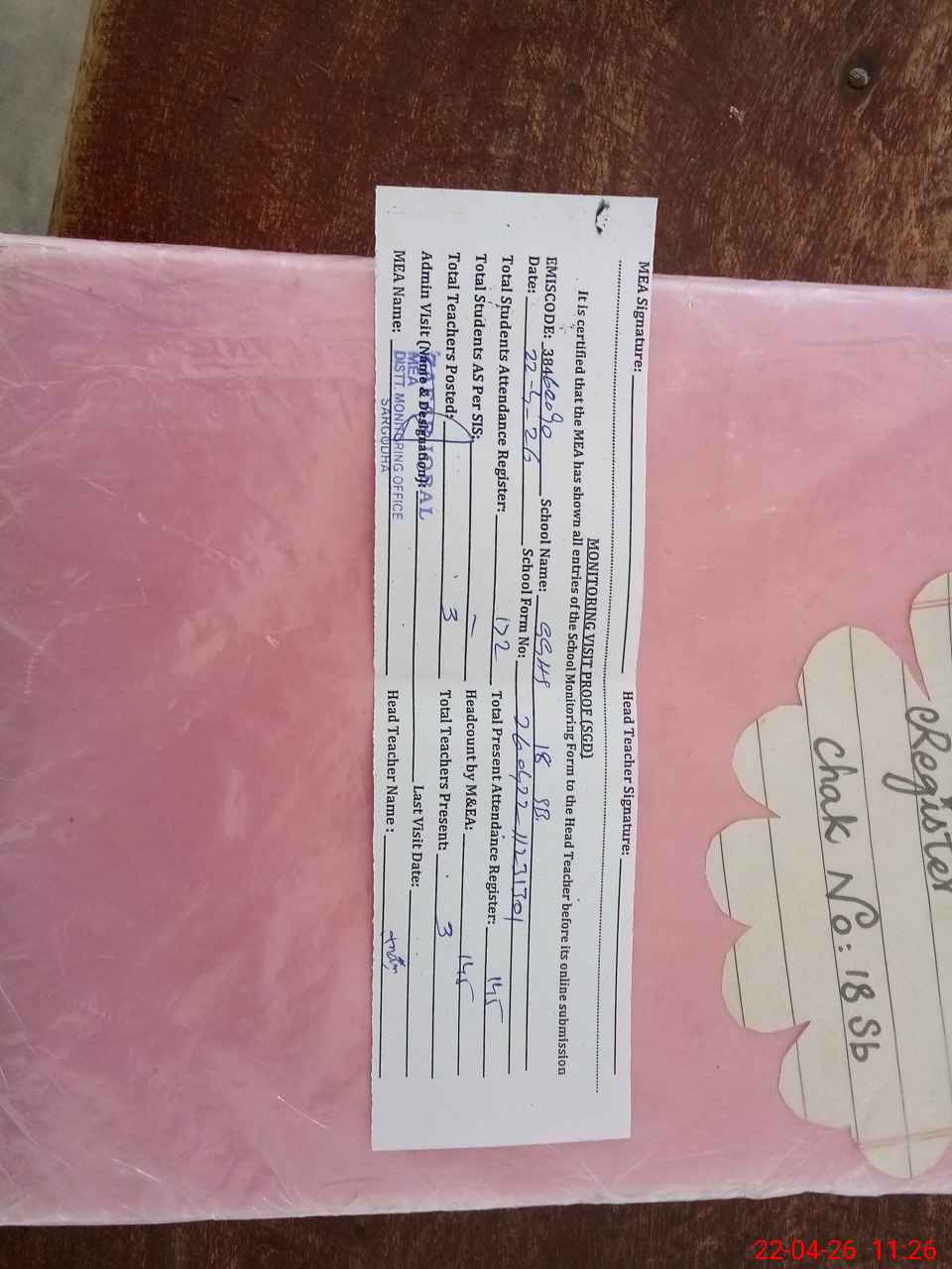 | Attendance Register | Head Teacher | MEA with School | Visit Proof |