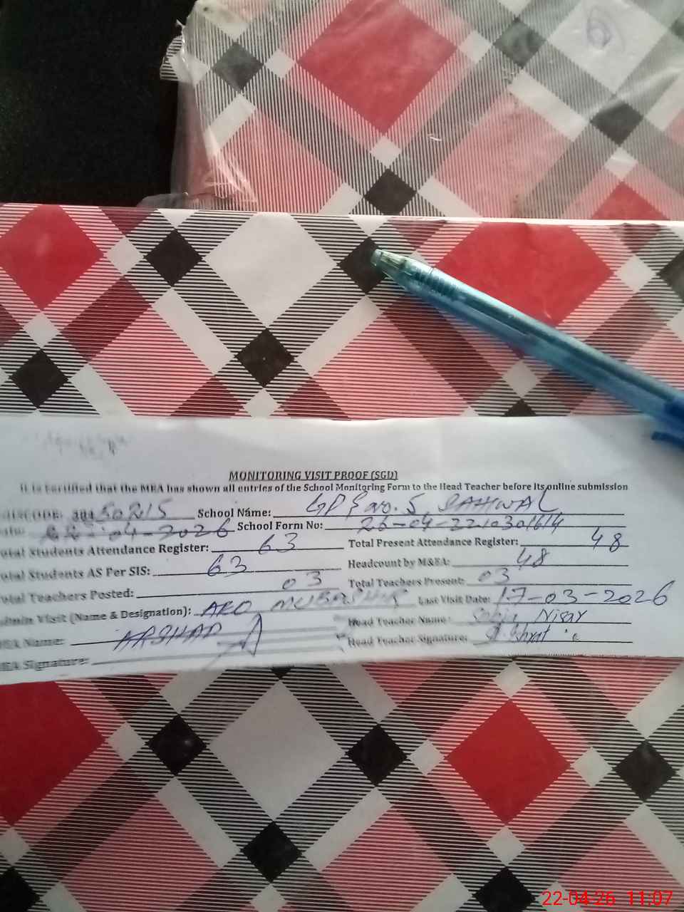 | Attendance Register | Head Teacher | MEA with School | Visit Proof |