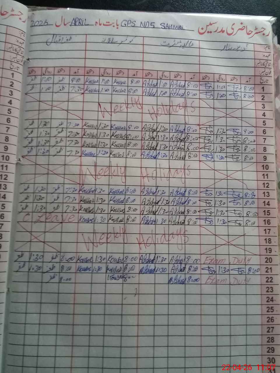 | Leave | Duty | Absent | Maternity | Medical | Ex- Pak |