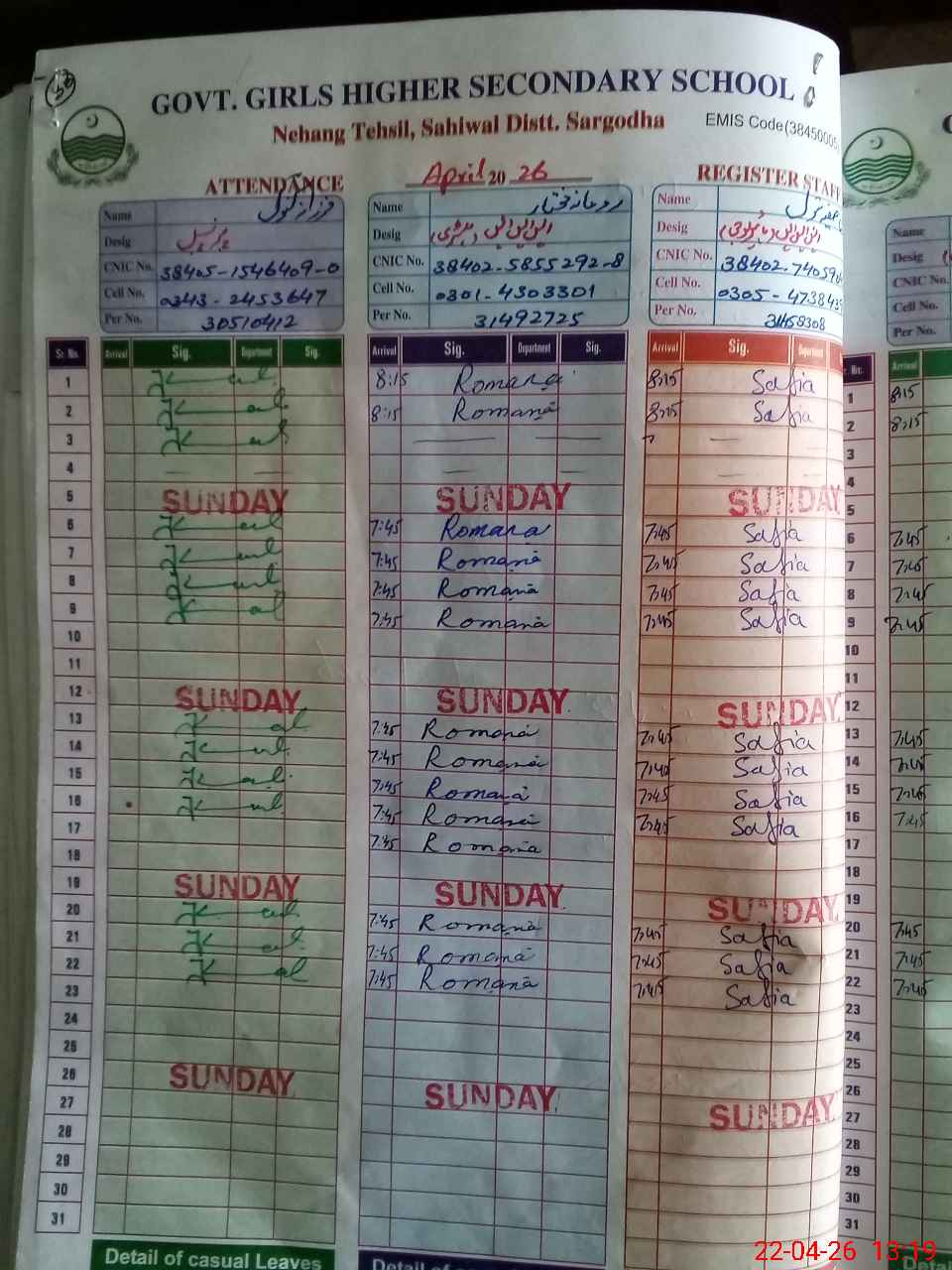 | CNIC | Full Name | Designation | R/C | Absence During Last Calender Month |