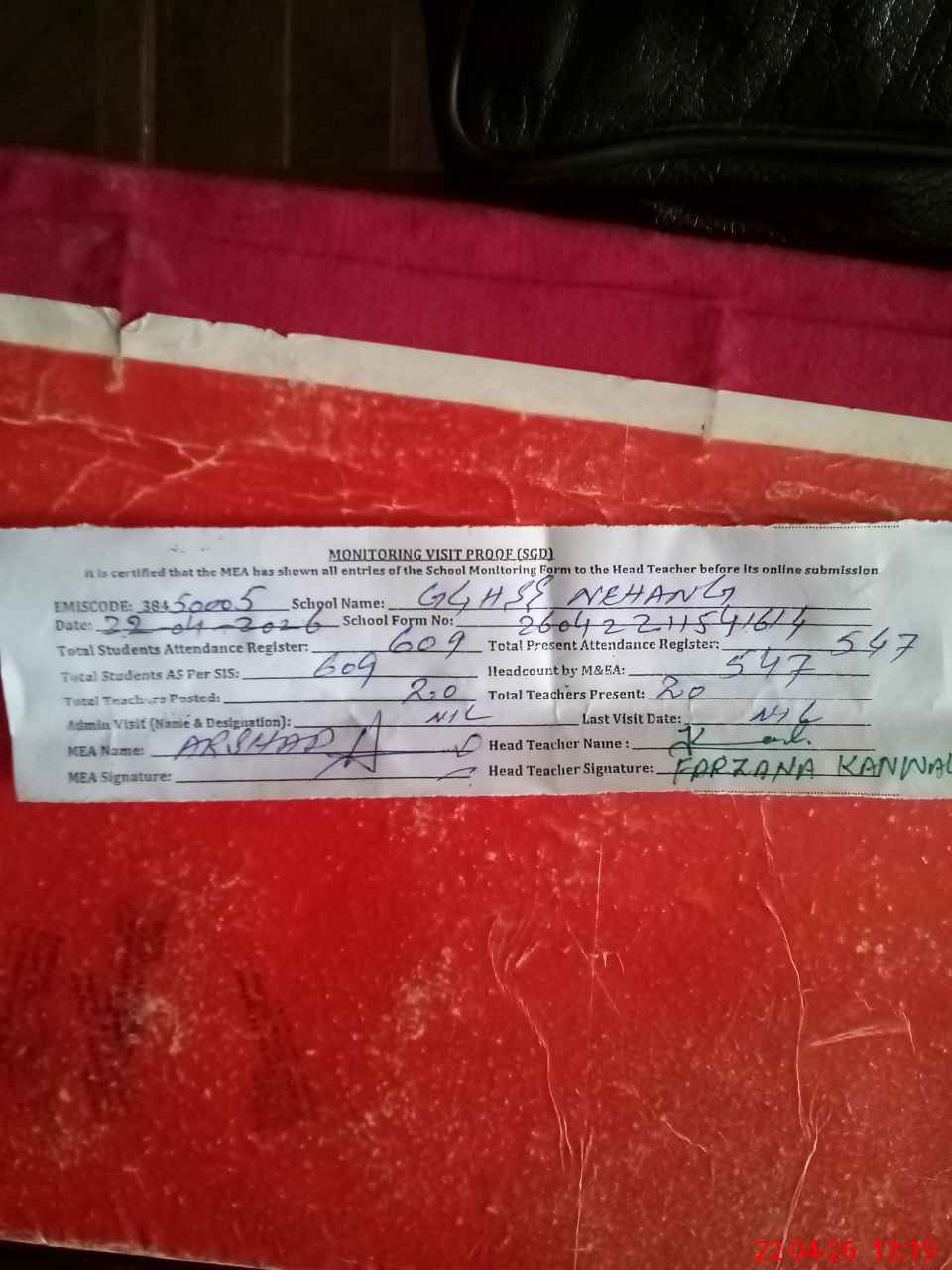 | Attendance Register | Head Teacher | MEA with School | Visit Proof |