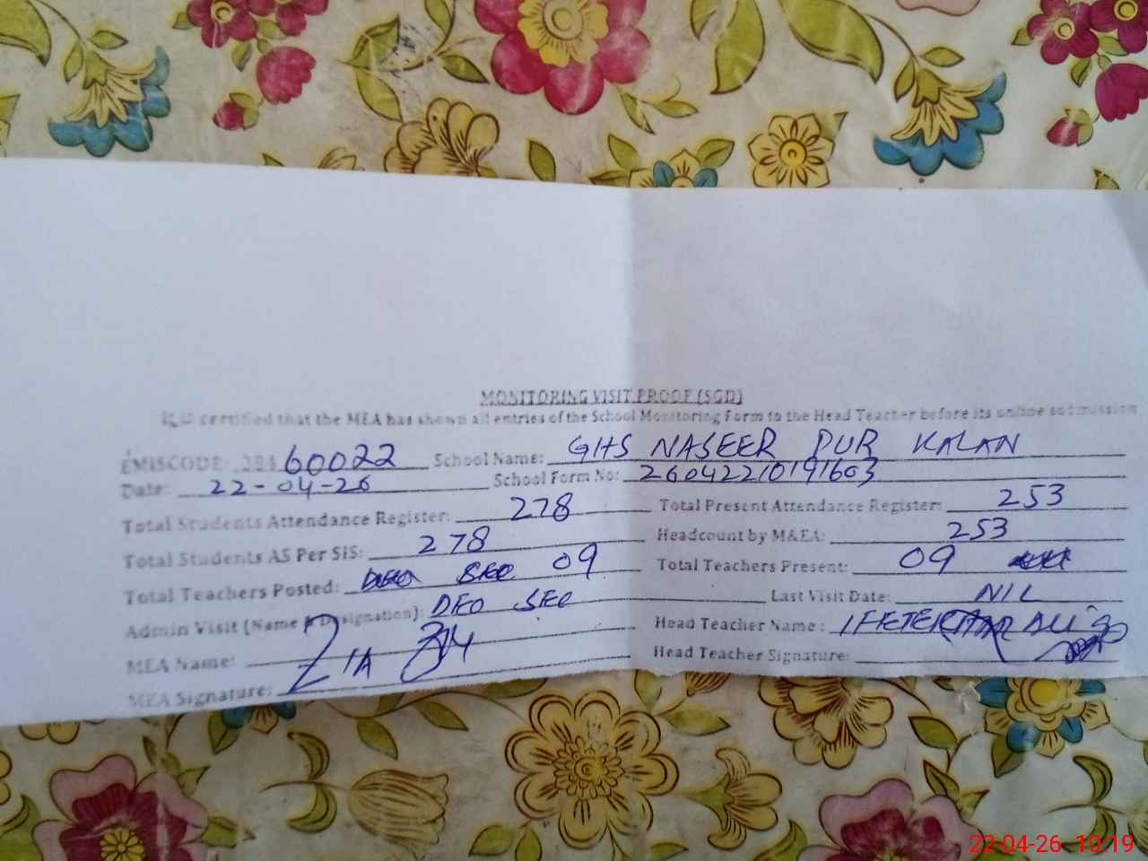 | Attendance Register | Head Teacher | MEA with School | Visit Proof |