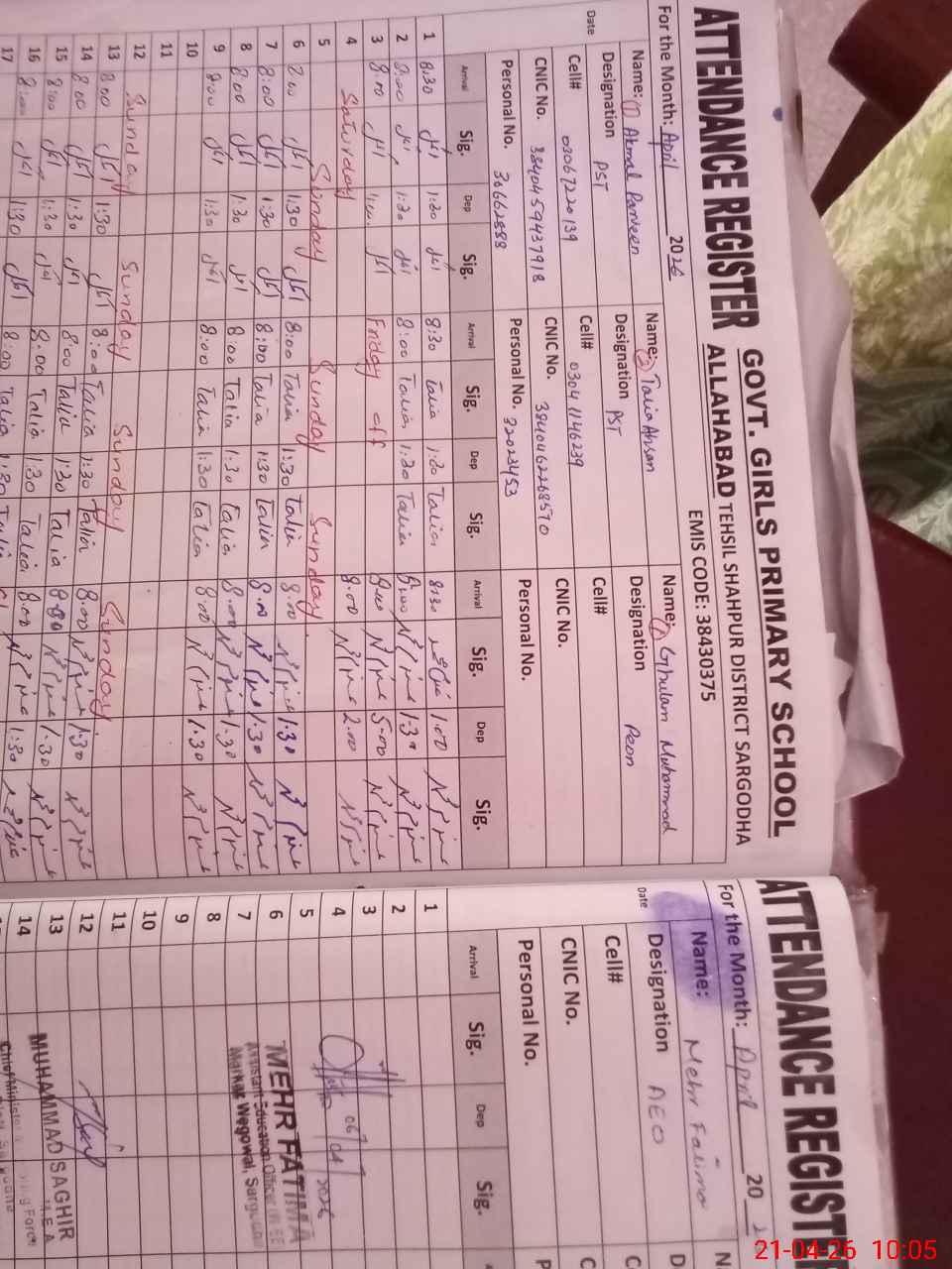 | Name: AK**** PA**** Designation: (School Headmaster's/Headmistress's) PST Phone/Cell Number: 03**** |