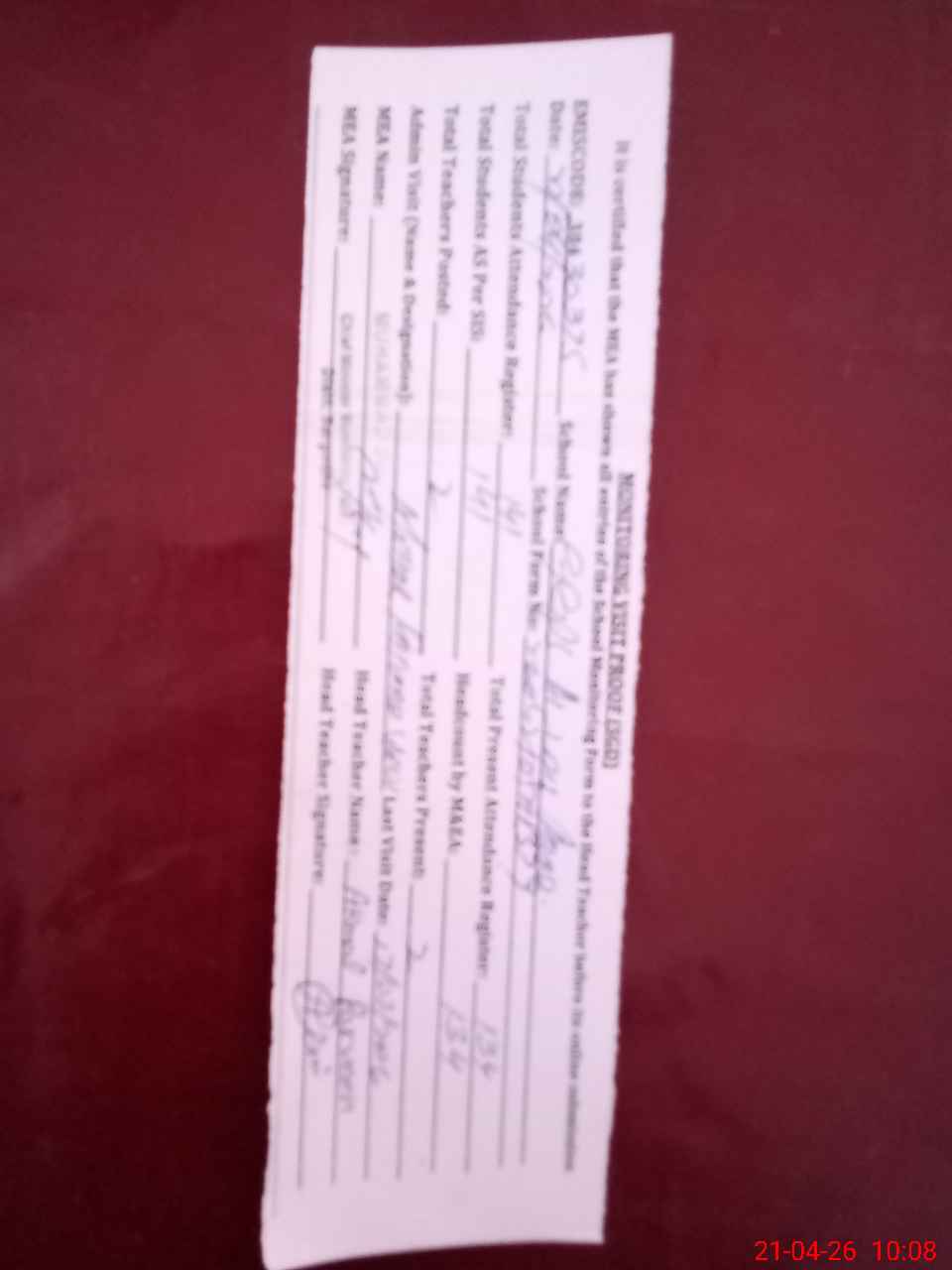 | Attendance Register | Head Teacher | MEA with School | Visit Proof |