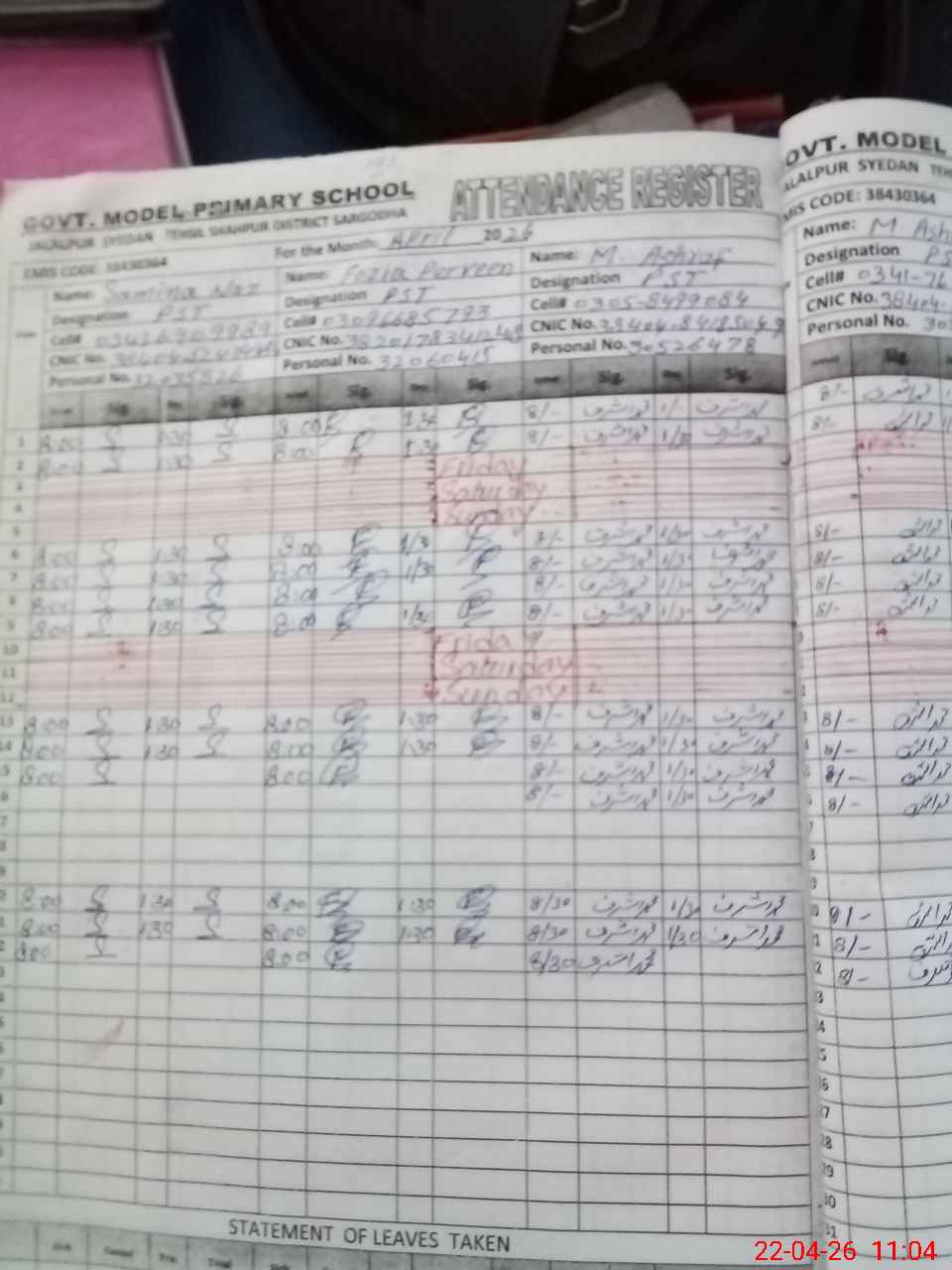 | Name: SA**** NA**** Designation: (School Headmaster's/Headmistress's) PST Phone/Cell Number: 03**** |