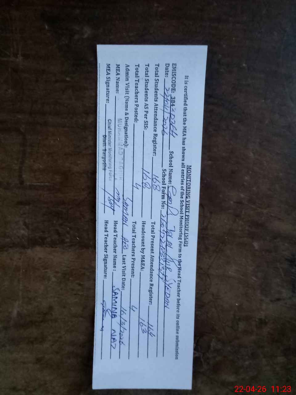 | Attendance Register | Head Teacher | MEA with School | Visit Proof |