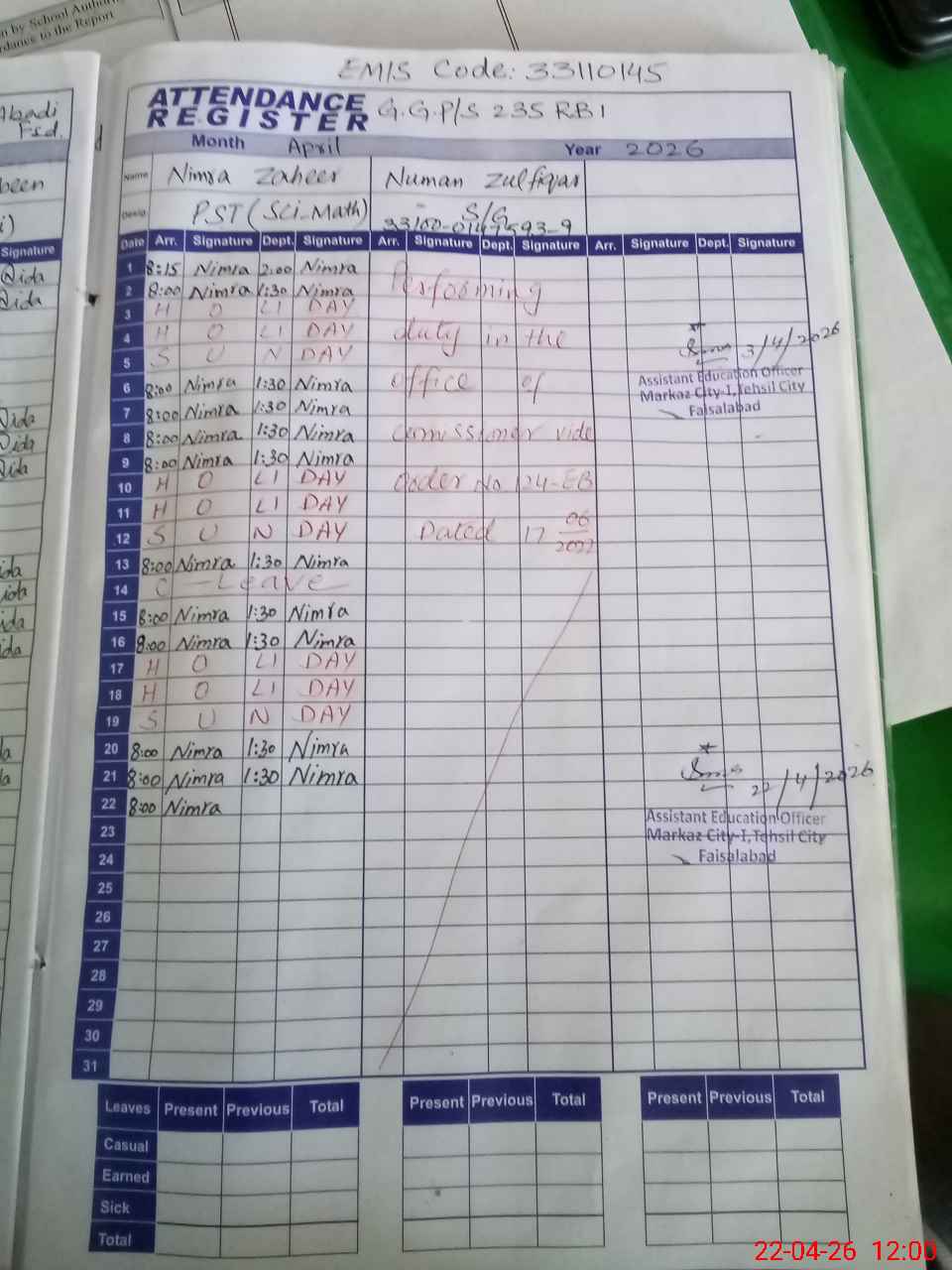 | CNIC | Full Name | Designation | R/C | Absence During Last Calender Month |