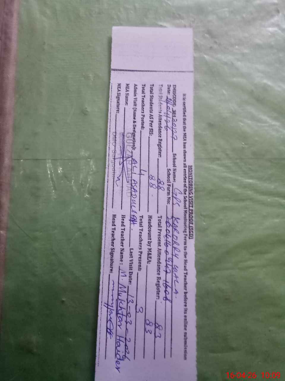 | Attendance Register | Head Teacher | MEA with School | Visit Proof |
