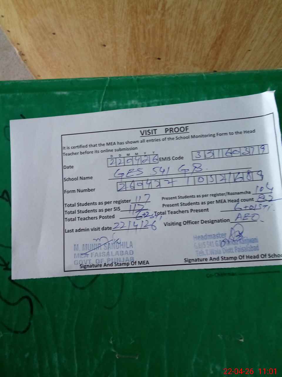 | Attendance Register | Head Teacher | MEA with School | Visit Proof |
