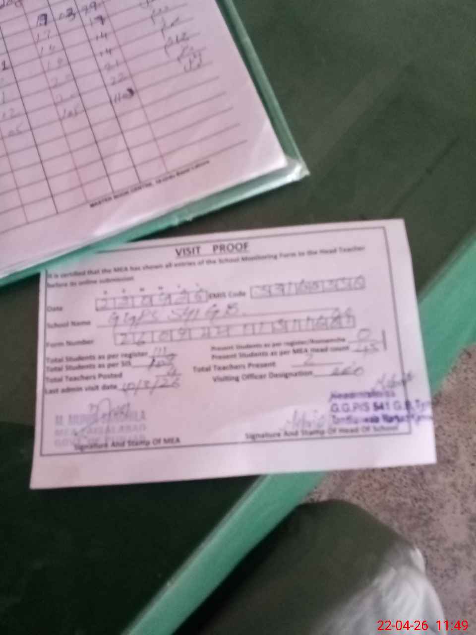 | Attendance Register | Head Teacher | MEA with School | Visit Proof |