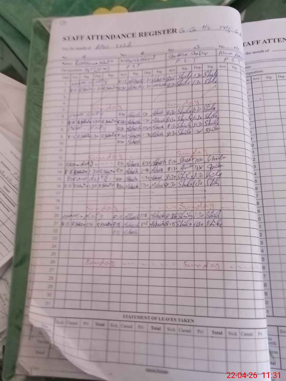 | 33**** | Sh**** Sh**** | PST Arts | Regular | 0 | 0 | 0 | 0 | 0 | 0 | 0 | 0 | 0 | Absent (Un-Authorized) |