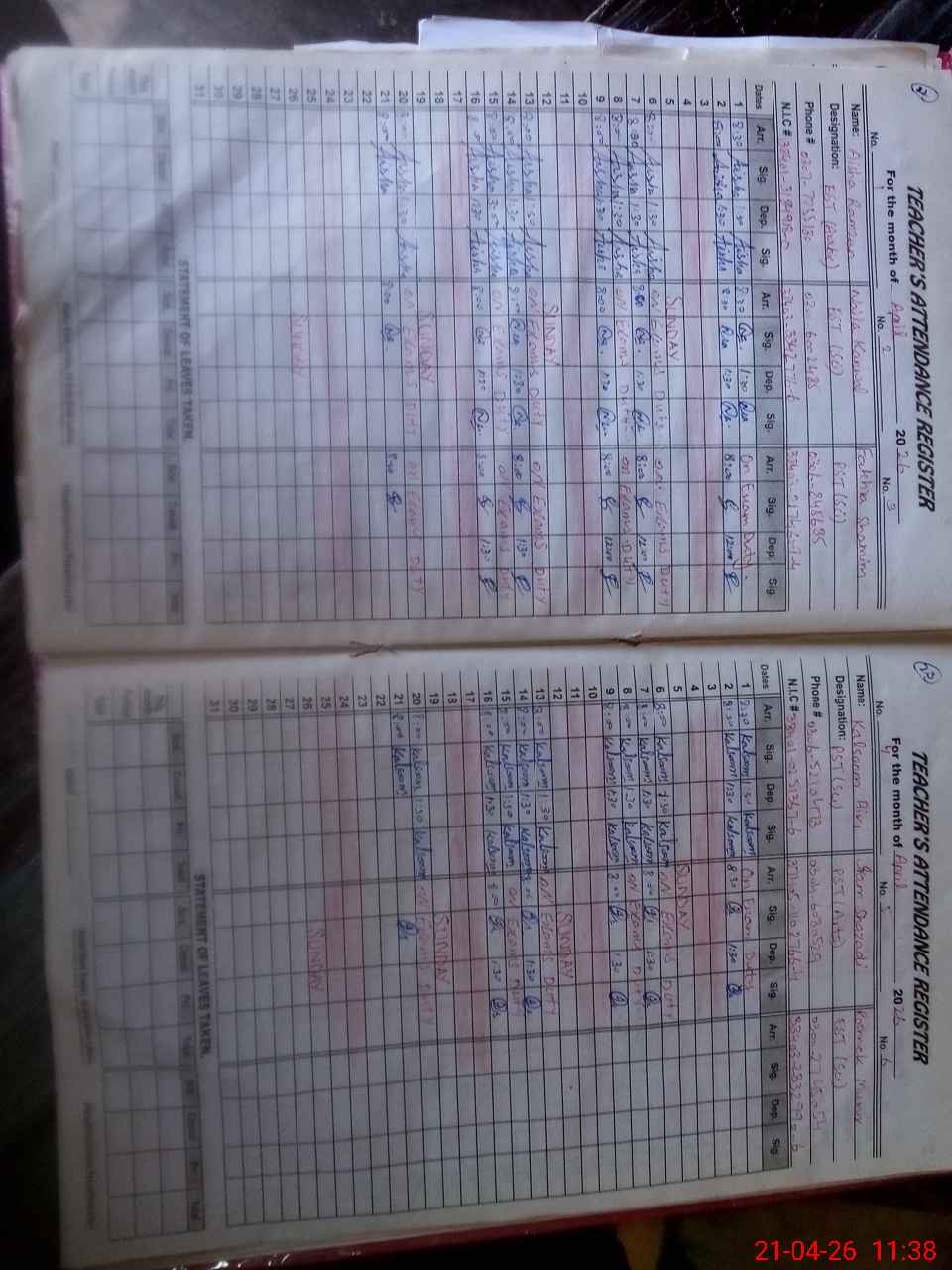 | CNIC | Full Name | Designation | R/C | Absence During Last Calender Month |