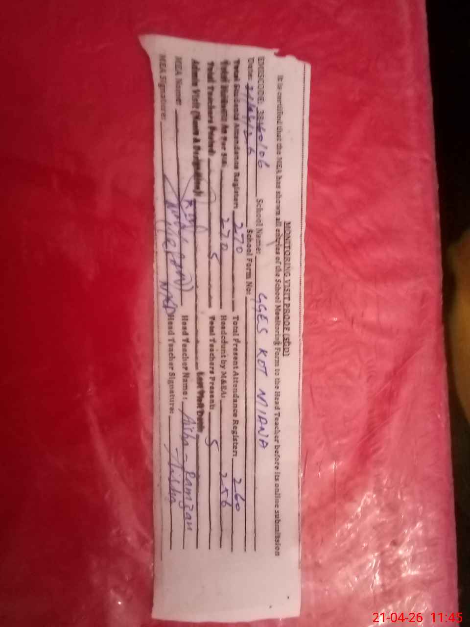 | Attendance Register | Head Teacher | MEA with School | Visit Proof |