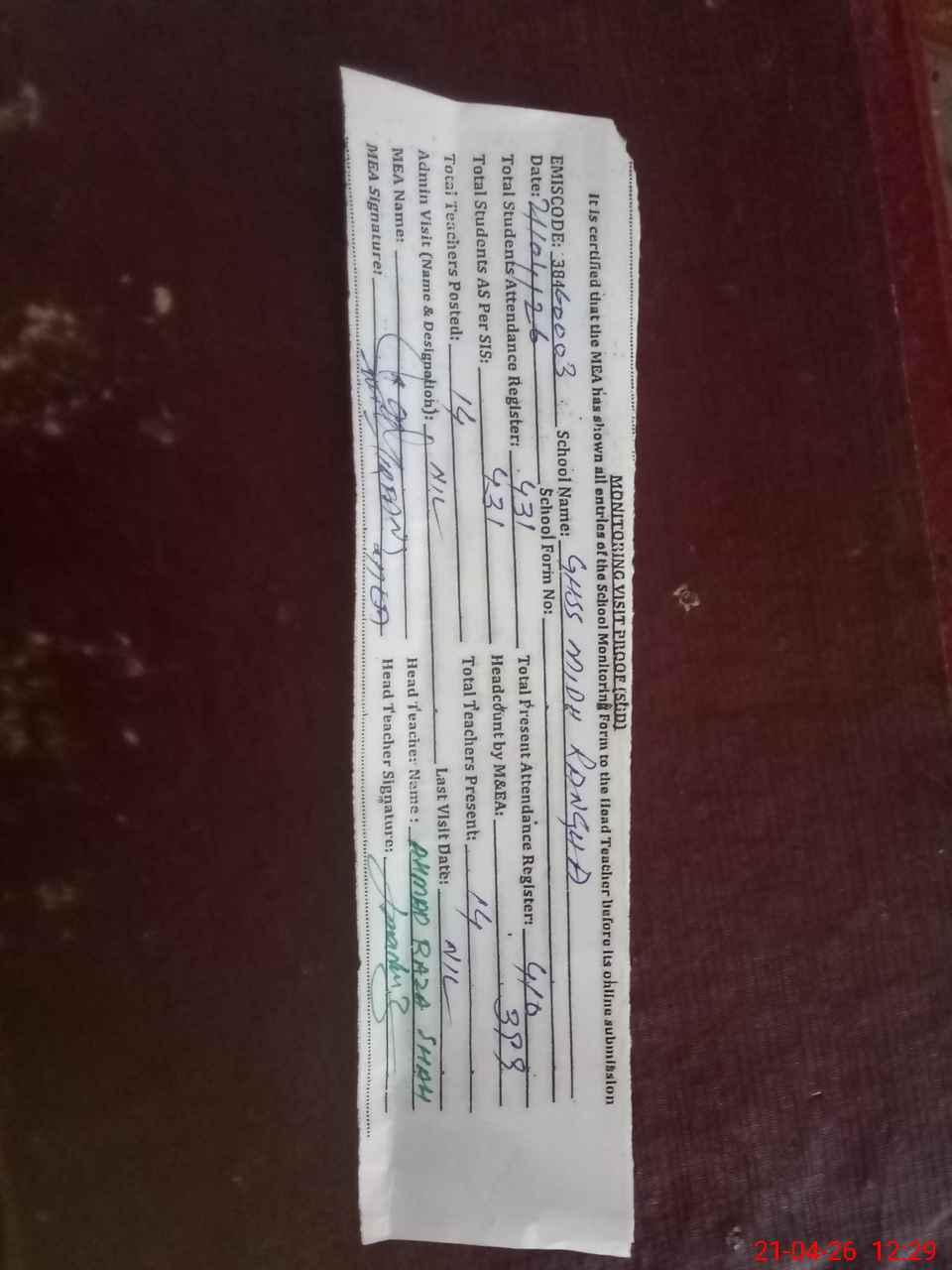 | Attendance Register | Head Teacher | MEA with School | Visit Proof |