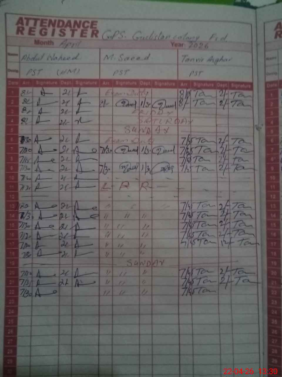 | CNIC | Full Name | Designation | R/C | Absence During Last Calender Month |