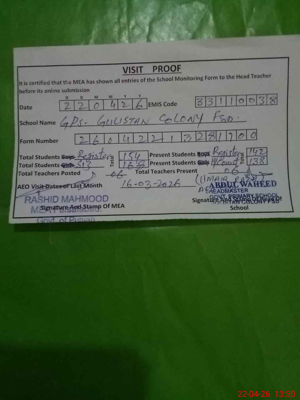 | EMIS Code: 33110038 | Name of School: GPS GULISTAN COLONY FSD | |||