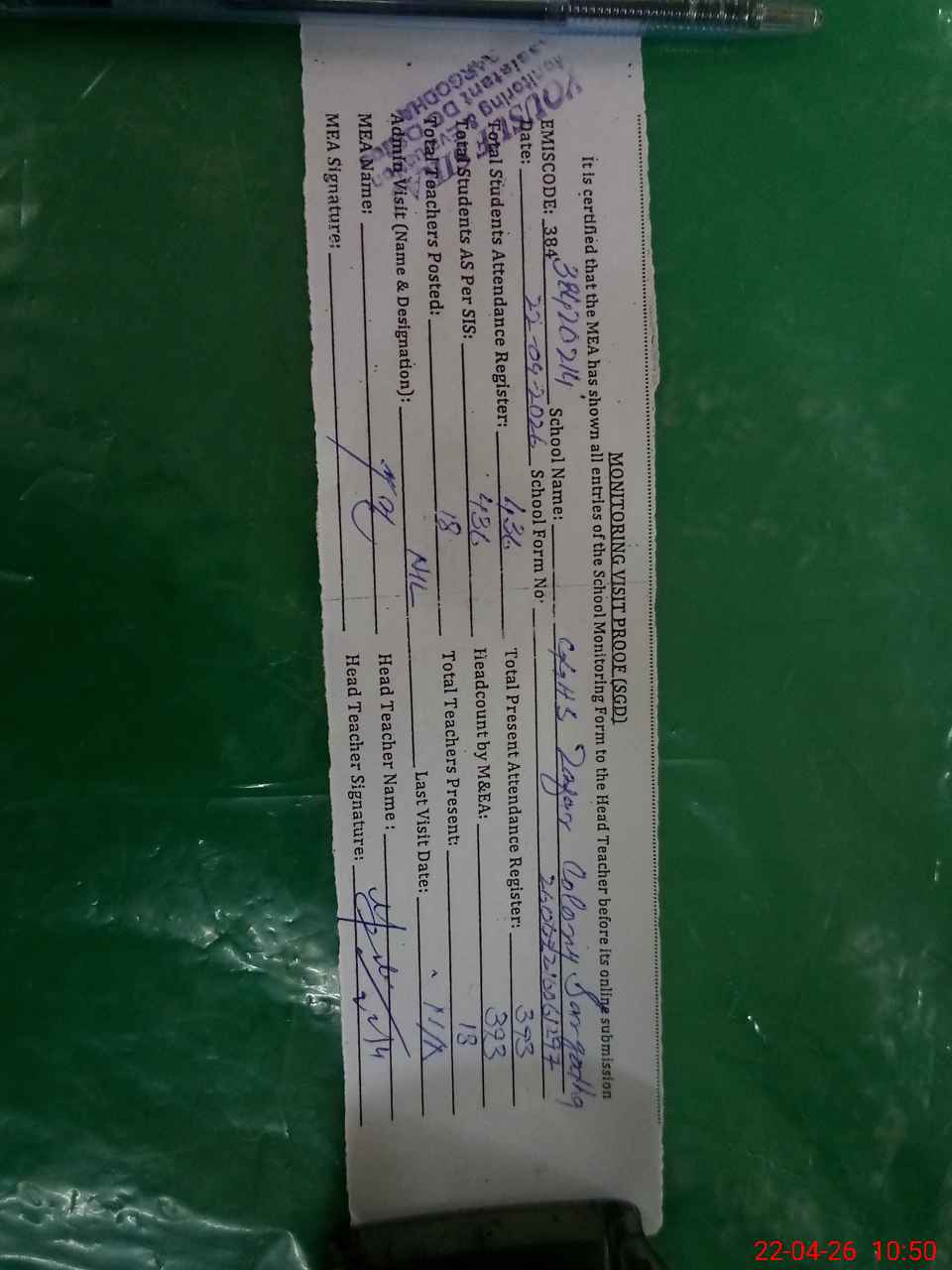| Attendance Register | Head Teacher | MEA with School | Visit Proof |