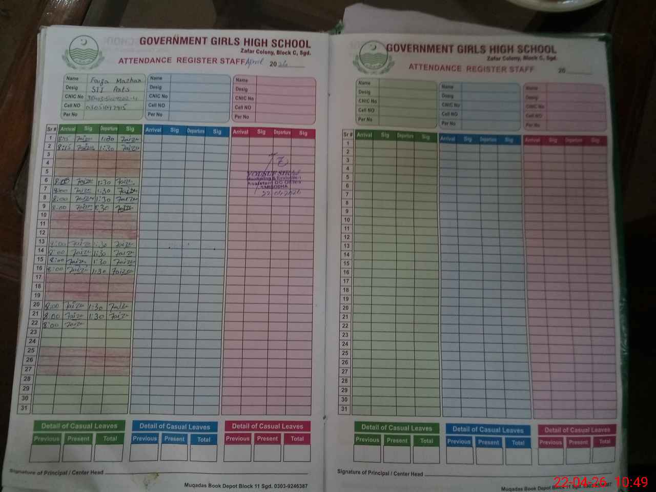 | CNIC | Full Name | Designation | R/C | Absence During Last Calender Month |