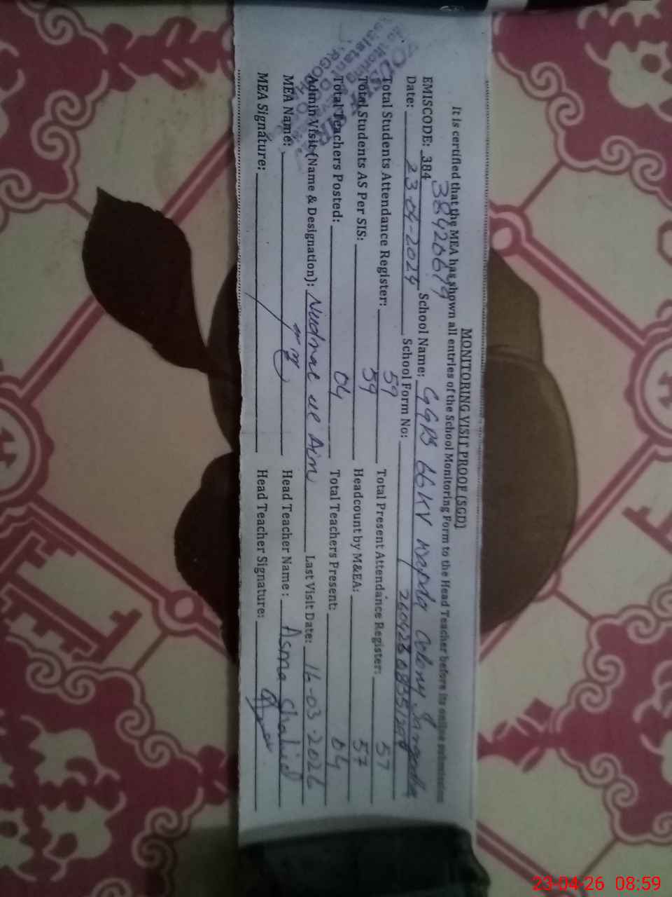 | Attendance Register | Head Teacher | MEA with School | Visit Proof |