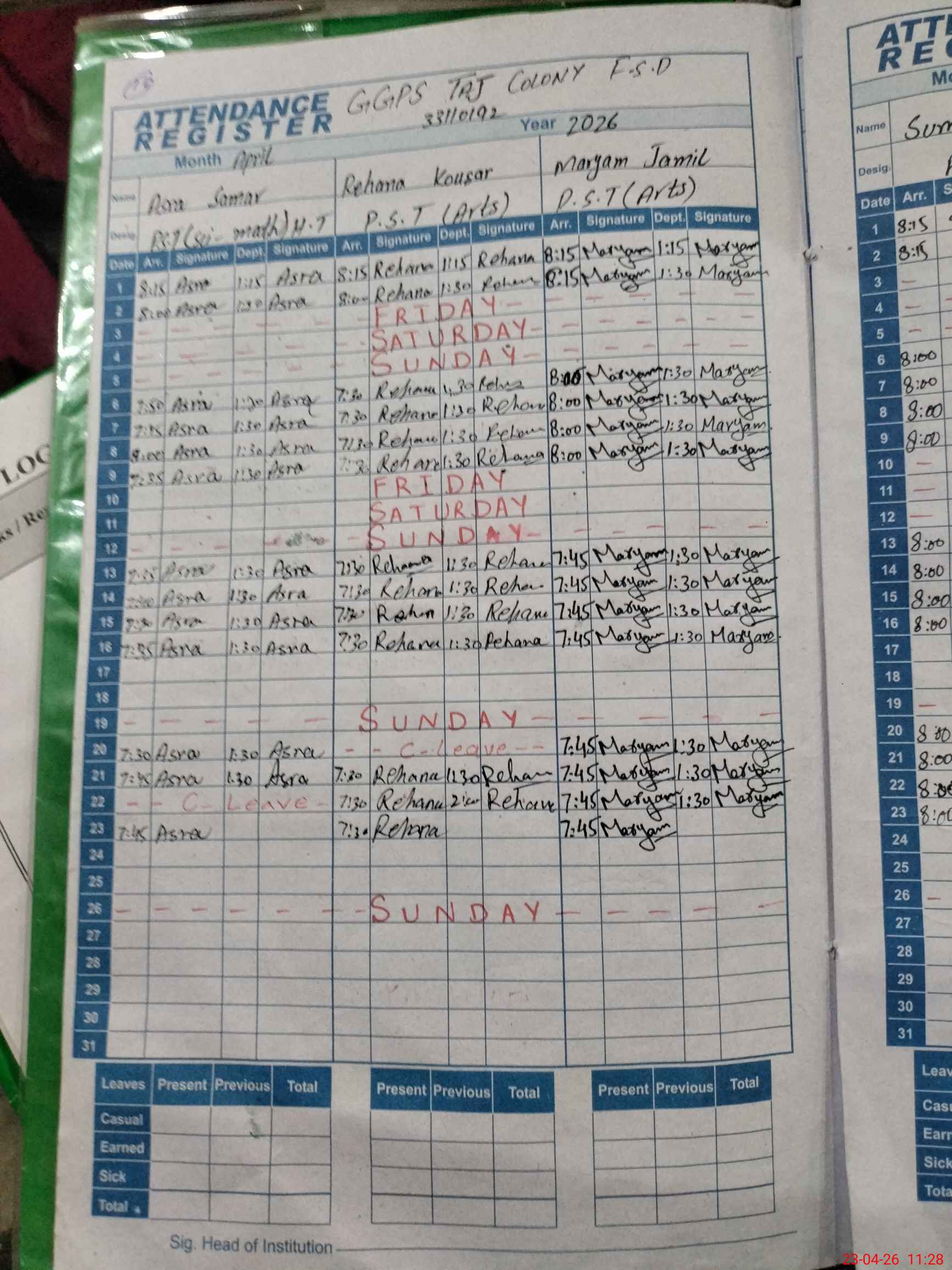 | Leave | Duty | Absent | Maternity | Medical | Ex- Pak |