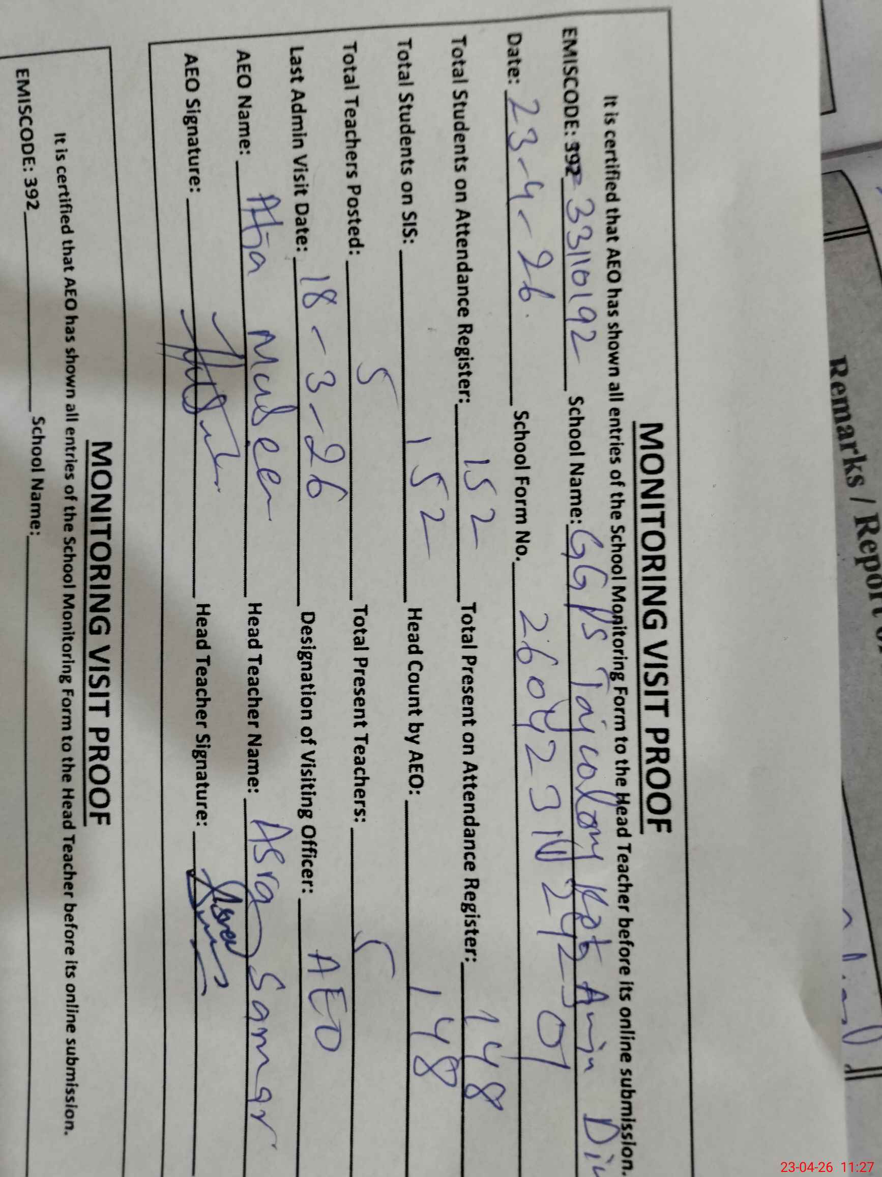 | Attendance Register | Head Teacher | MEA with School | Visit Proof |