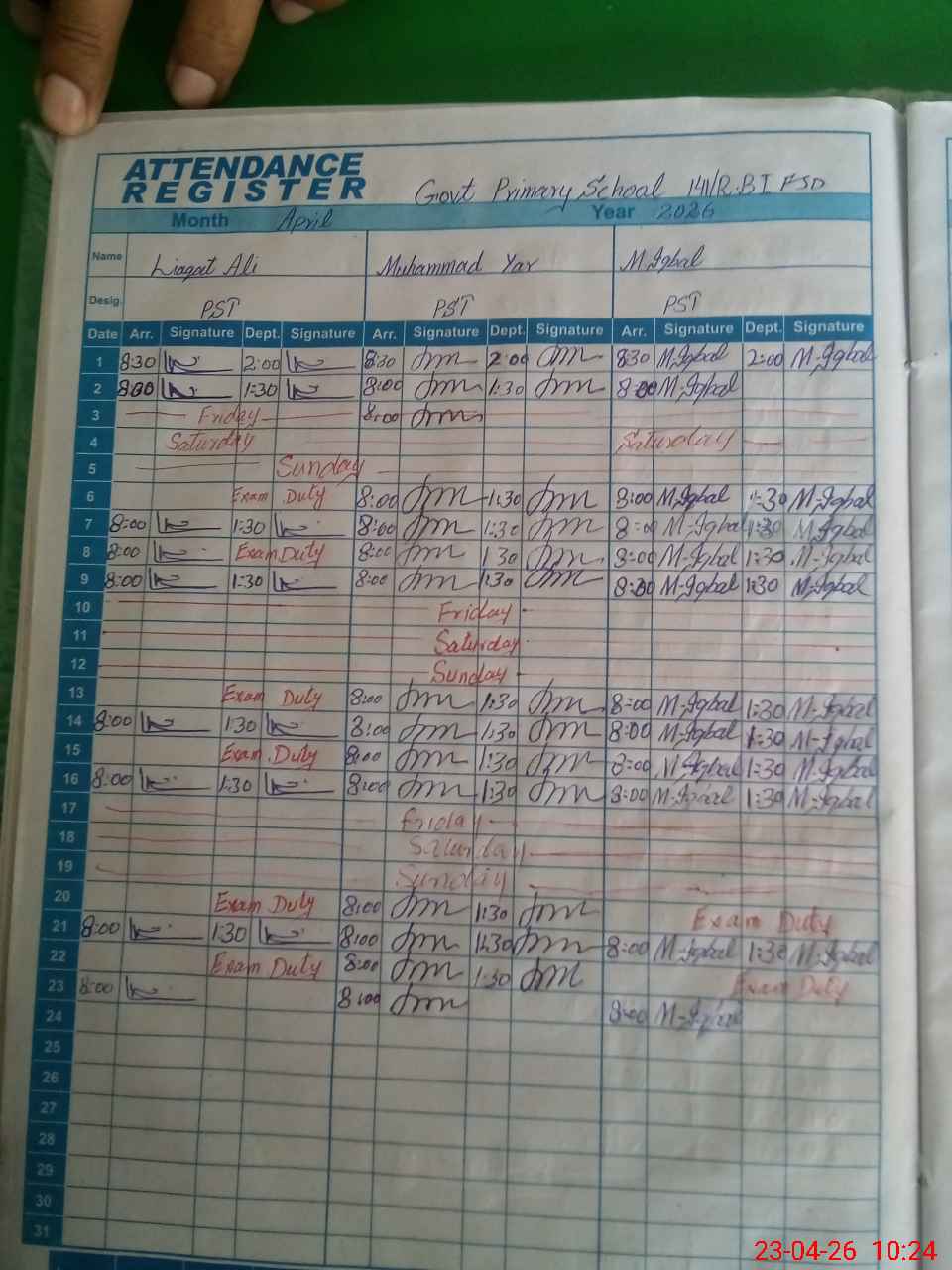 | CNIC | Full Name | Designation | R/C | Absence During Last Calender Month |