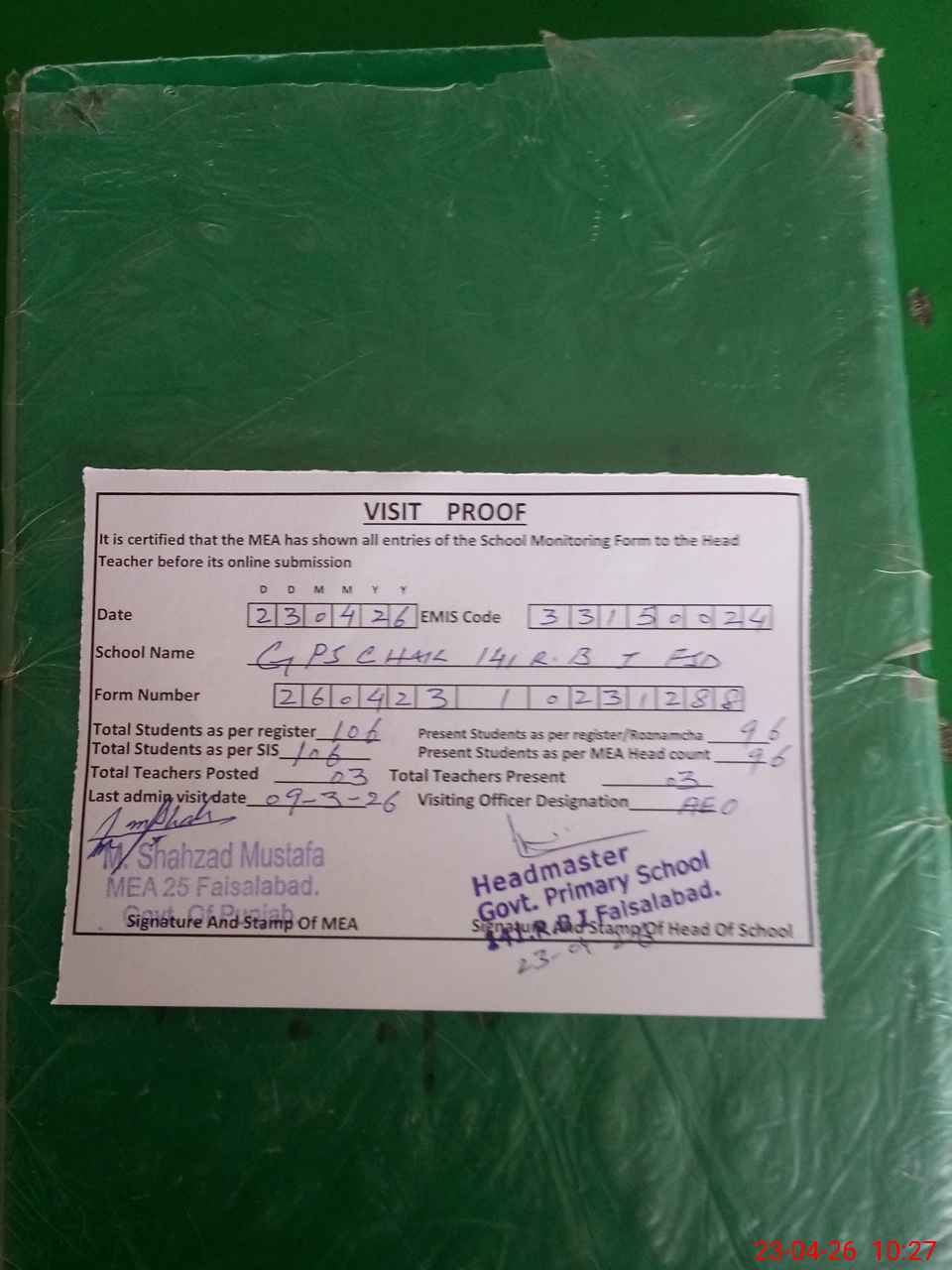 | Attendance Register | Head Teacher | MEA with School | Visit Proof |