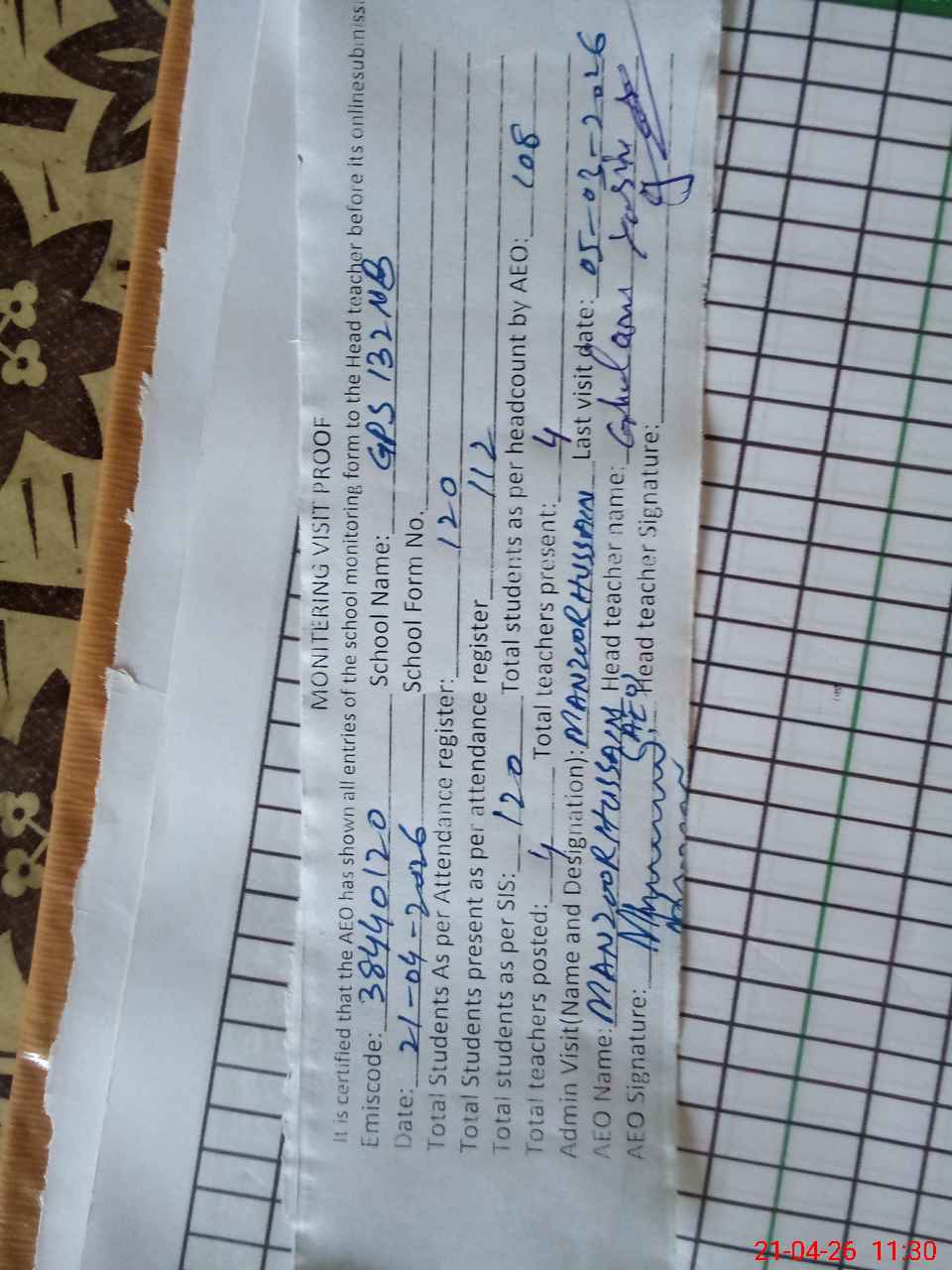 | Attendance Register | Head Teacher | MEA with School | Visit Proof |