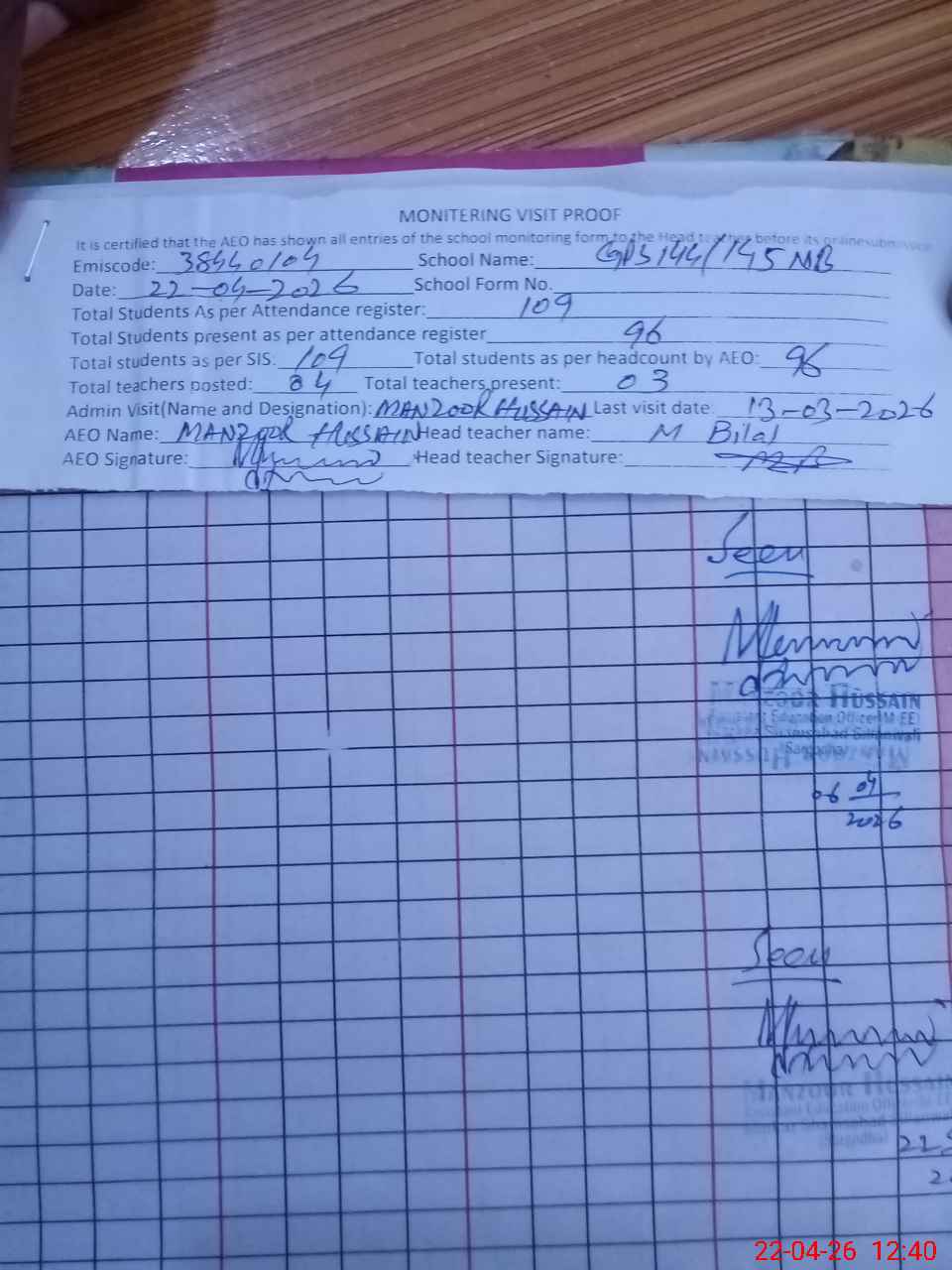 | Monitoring Date: 22-04-2026 | Start Time: 22-04-2026 12:15 PM | End Time: 22-04-2026 12:40 PM | Name of MEA: Ma**** Hu**** | |