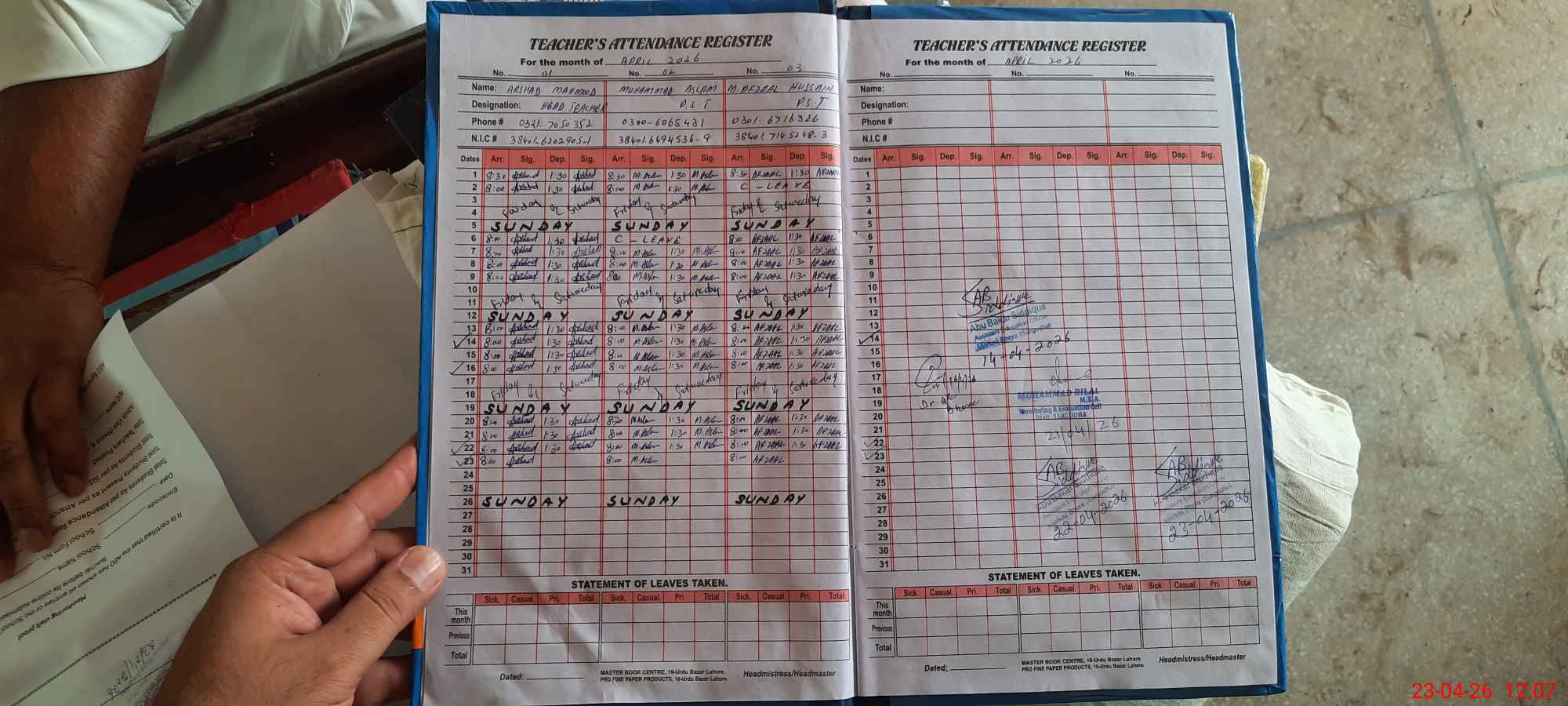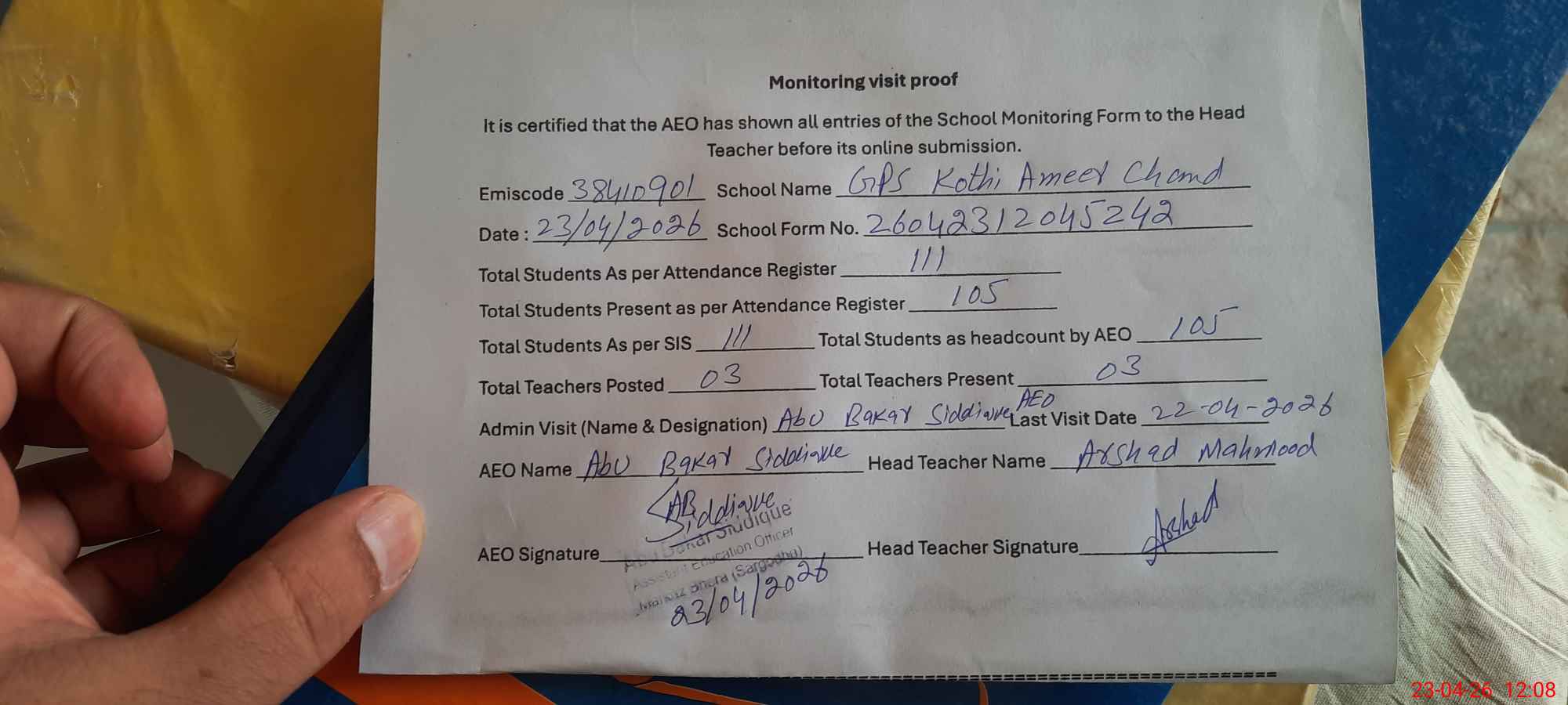 | Attendance Register | Head Teacher | MEA with School | Visit Proof |