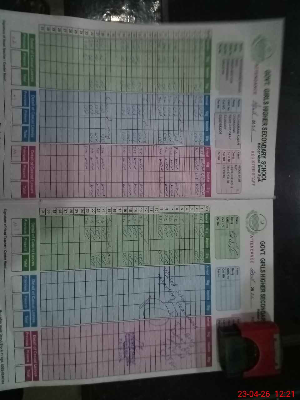 | CNIC | Full Name | Designation | R/C | Absence During Last Calender Month |