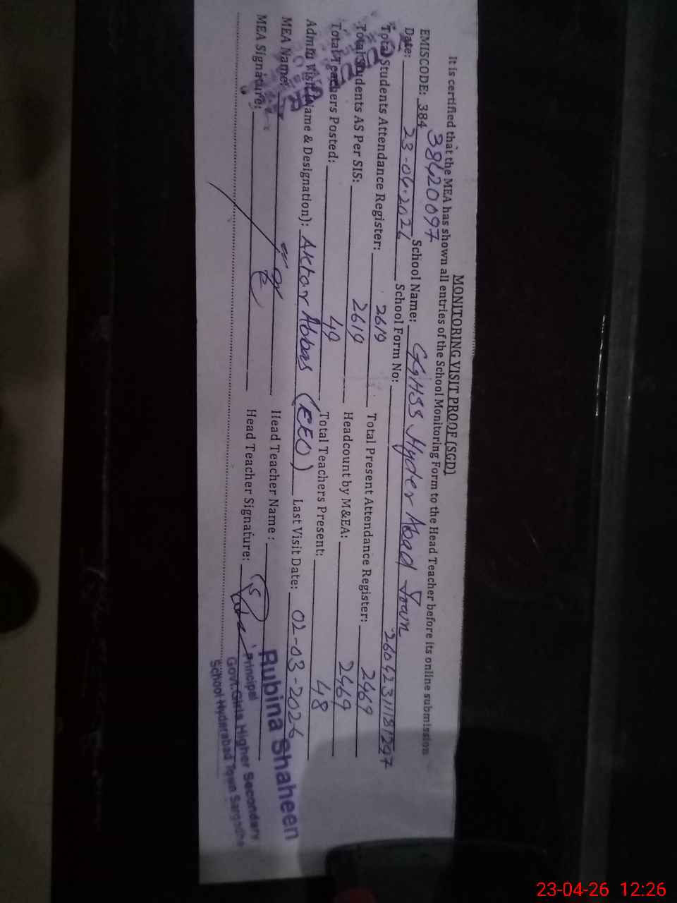 | Attendance Register | Head Teacher | MEA with School | Visit Proof |