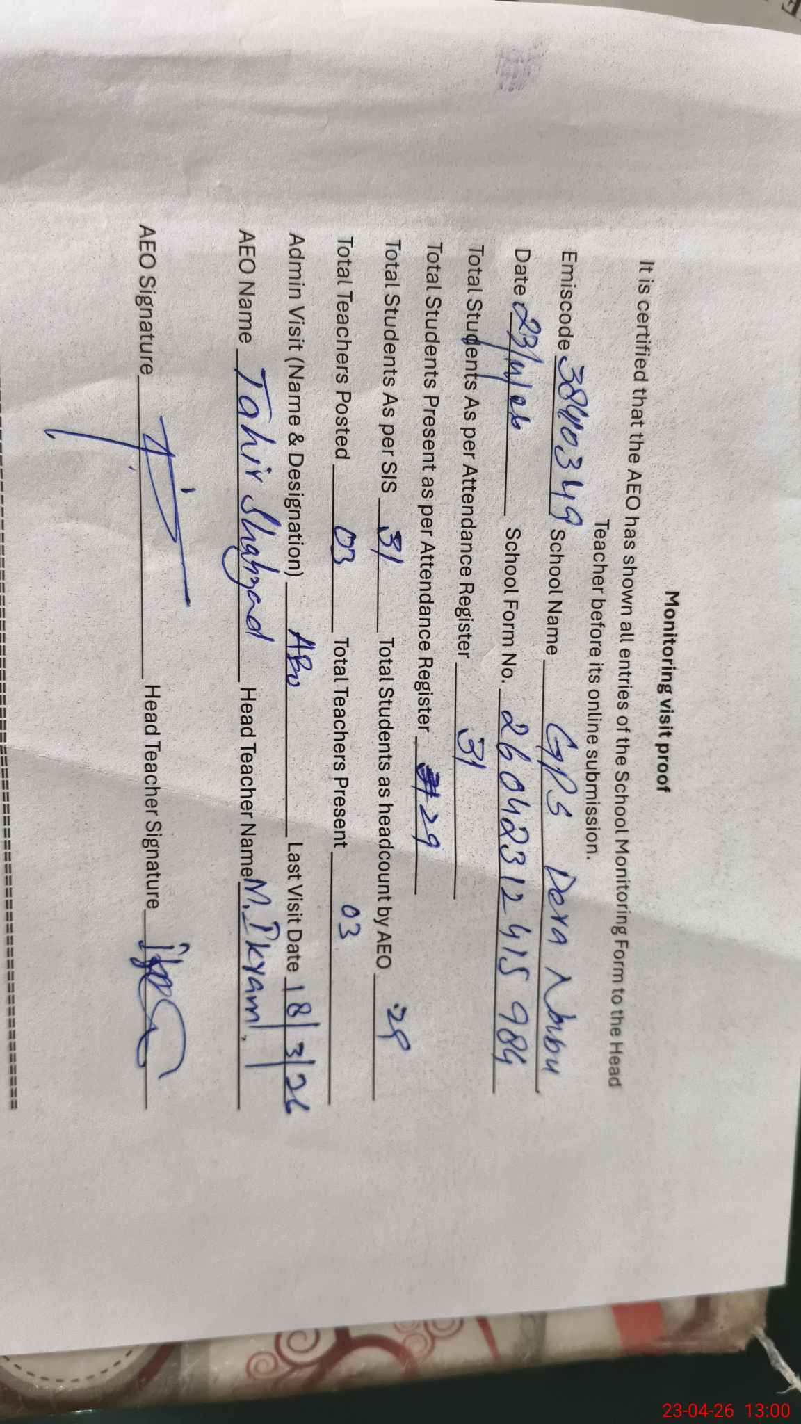 | Attendance Register | Head Teacher | MEA with School | Visit Proof |