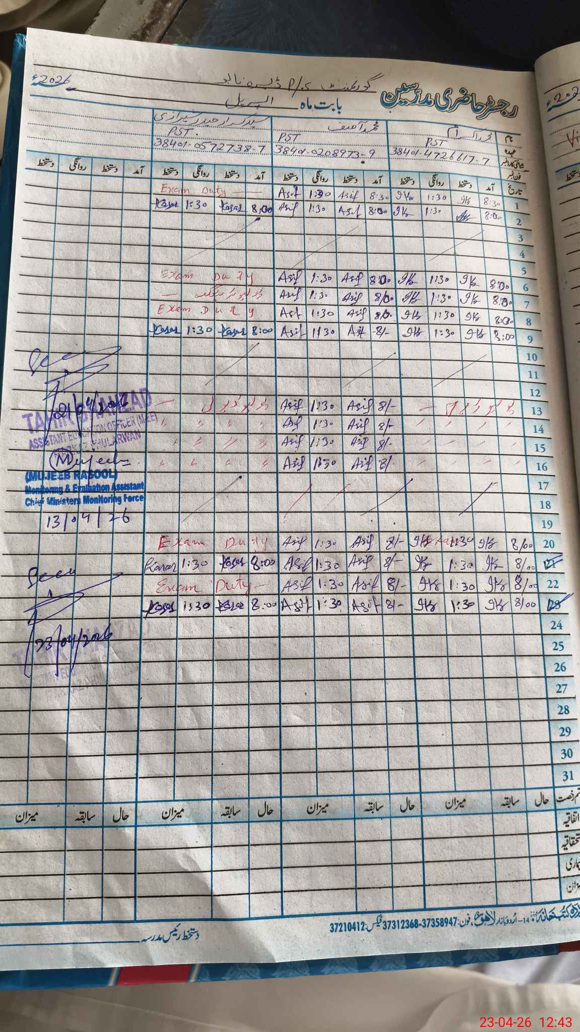 | Name: Mu**** Ik**** Designation: (School Headmaster's/Headmistress's) PST Phone/Cell Number: 03**** |