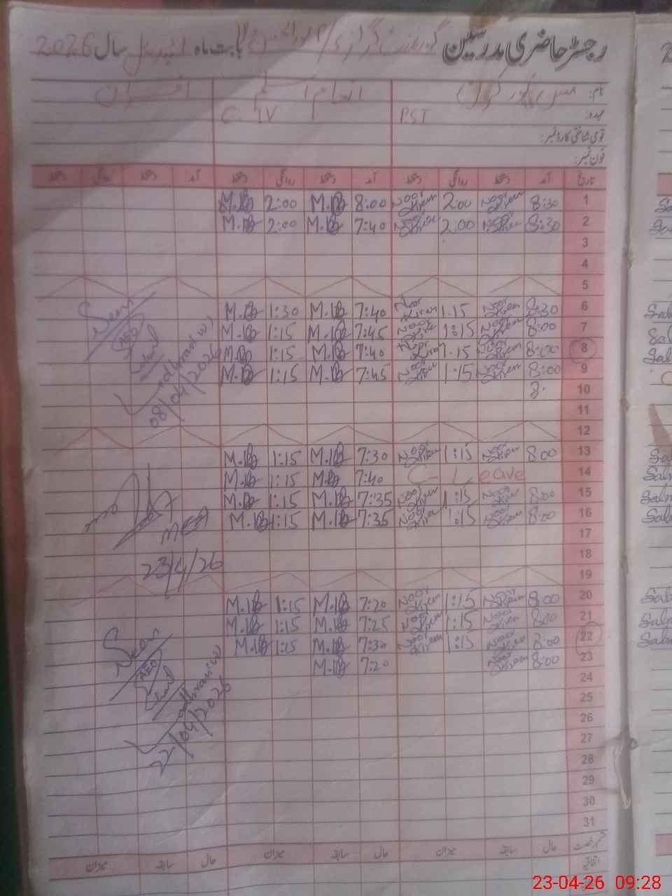 | CNIC | Full Name | Designation | R/C | Absence During Last Calender Month |