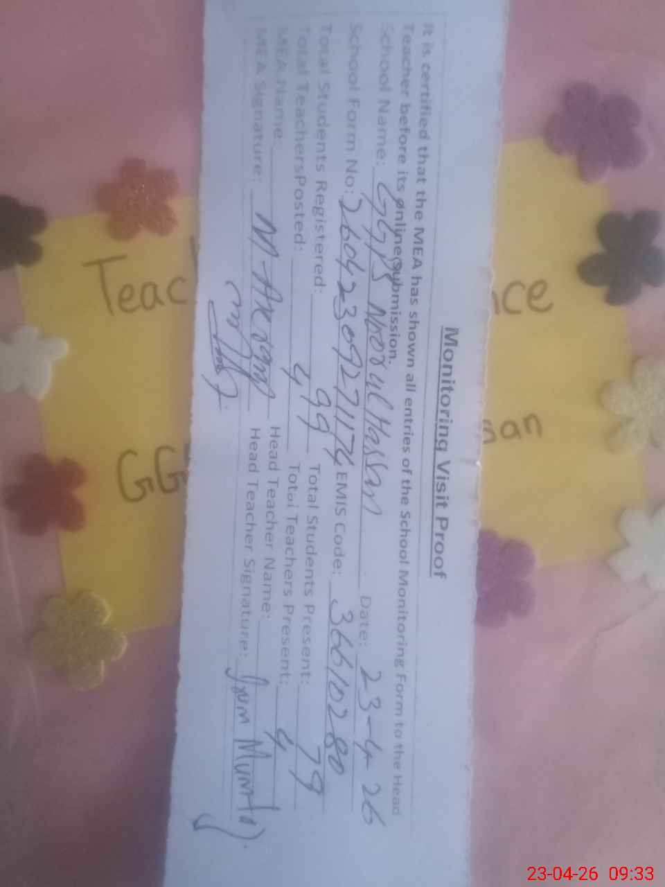 | Attendance Register | Head Teacher | MEA with School | Visit Proof |