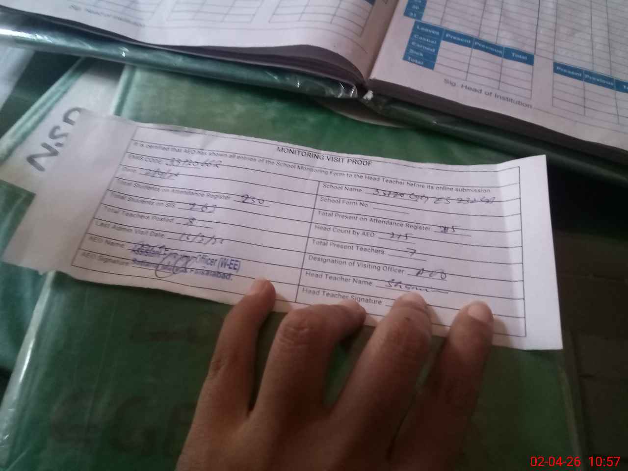 | Attendance Register | Head Teacher | MEA with School | Visit Proof |