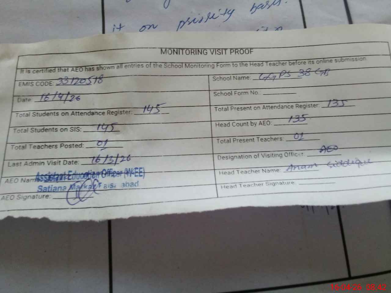 | Attendance Register | Head Teacher | MEA with School | Visit Proof |