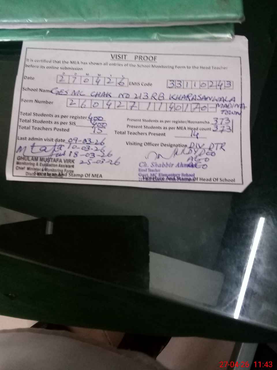 | Attendance Register | Head Teacher | MEA with School | Visit Proof |