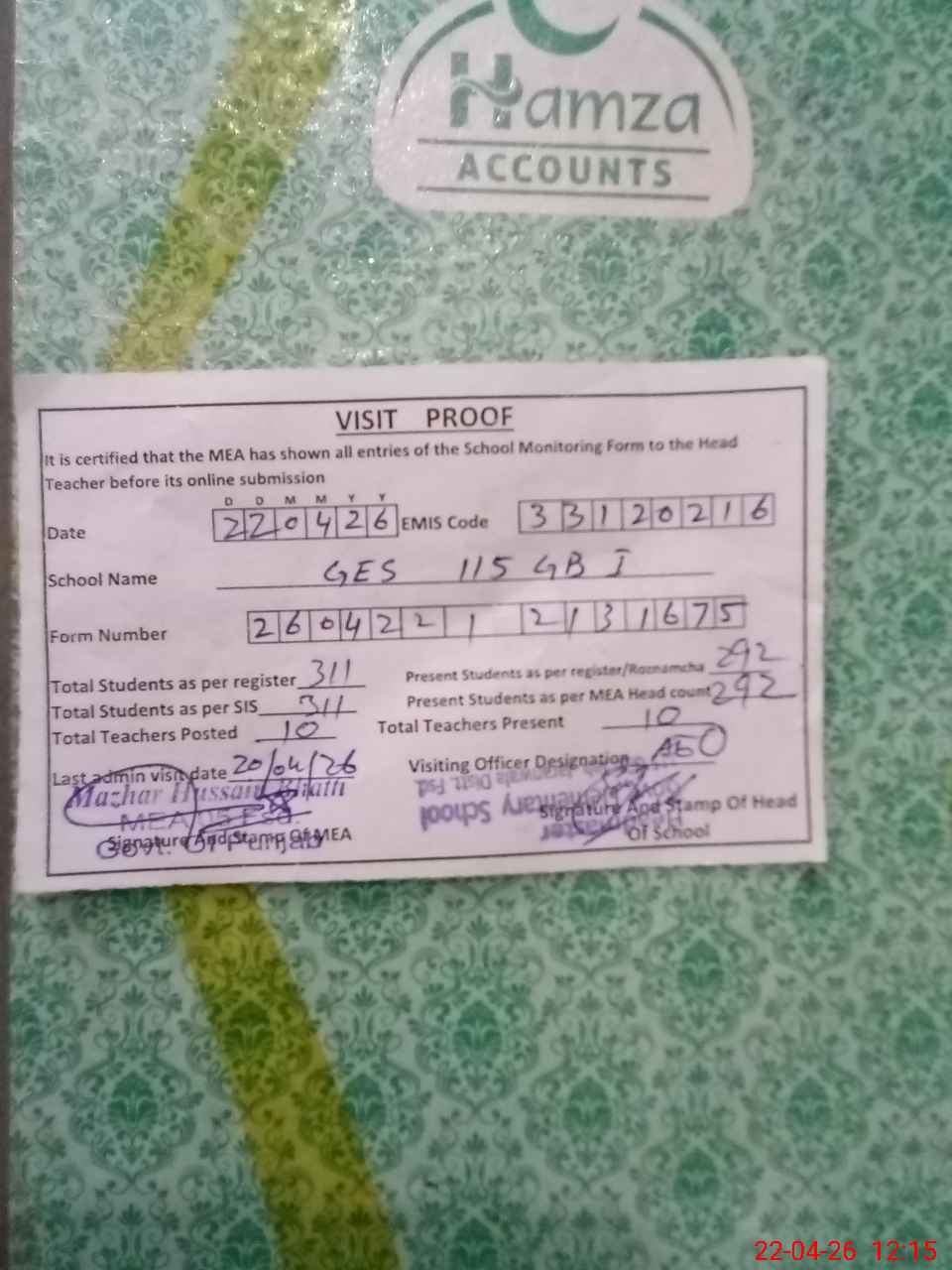 | EMIS Code: 33120216 | Name of School: GES CHAK 115 GB I | |||