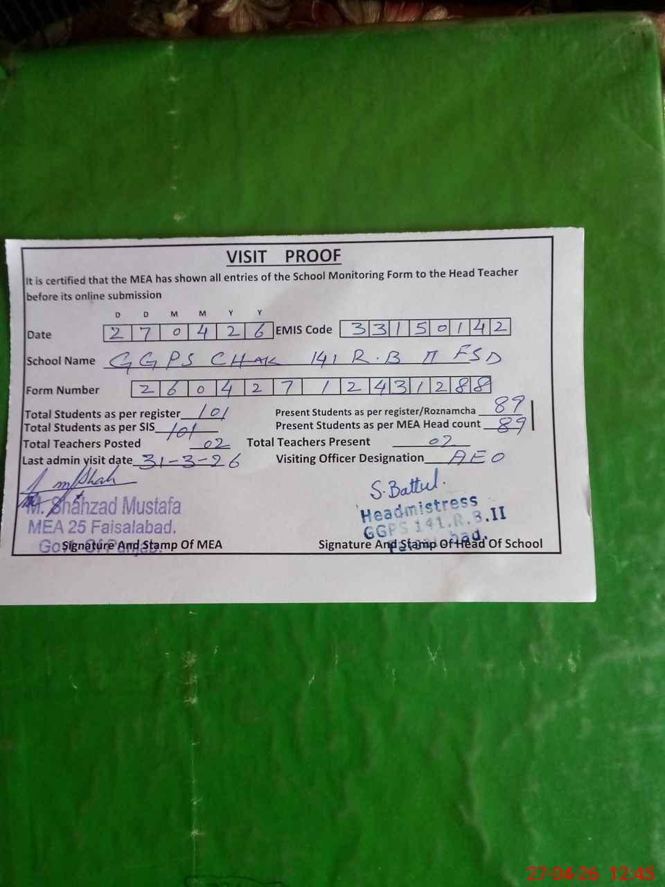 | EMIS Code: 33150142 | Name of School: GGPS CHAK NO. 141 RB II | |||