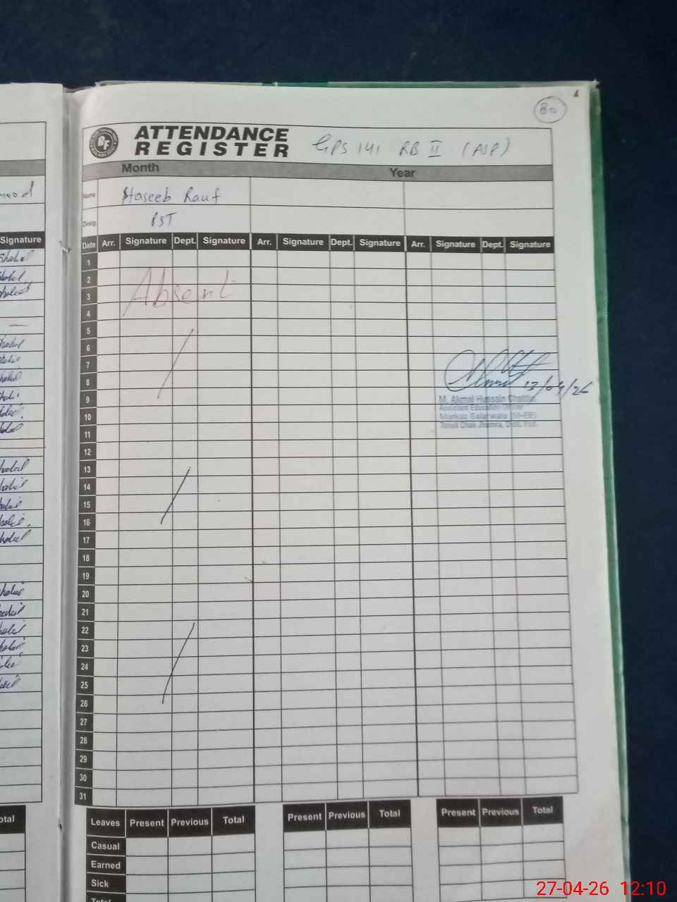 | 35**** | Ha**** Ra**** | PST Arts | Regular | 0 | 0 | 31 | 0 | 0 | 0 | 0 | 0 | 0 | Absent (Un-Authorized) |