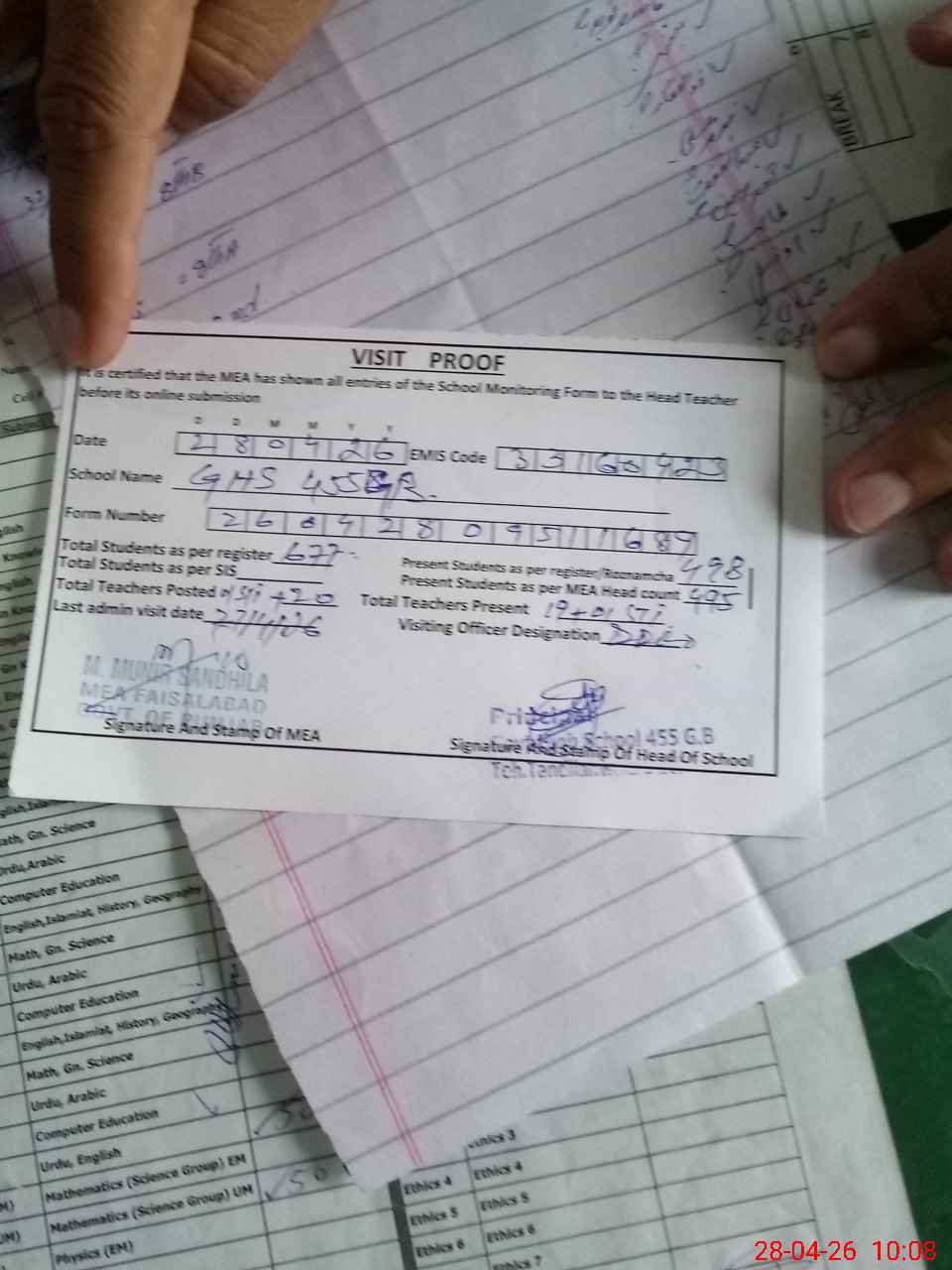 | Attendance Register | Head Teacher | MEA with School | Visit Proof |