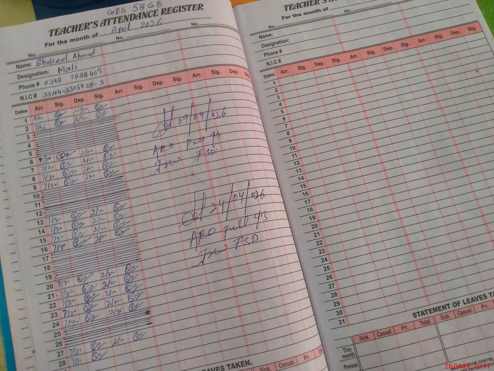 | CNIC | Full Name | Designation | R/C | Absence During Last Calender Month |