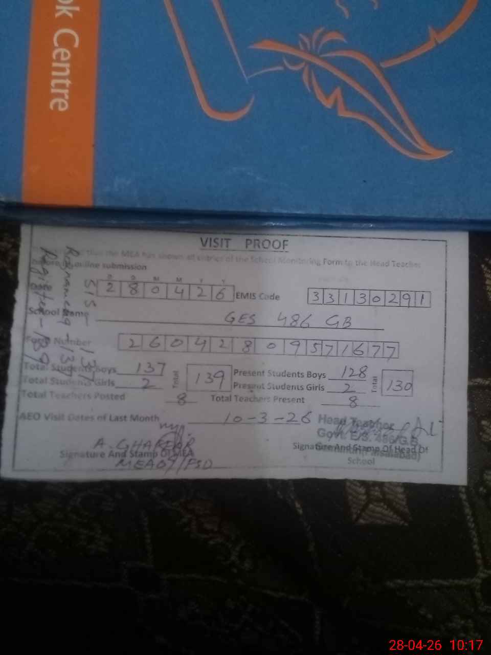 | Attendance Register | Head Teacher | MEA with School | Visit Proof |