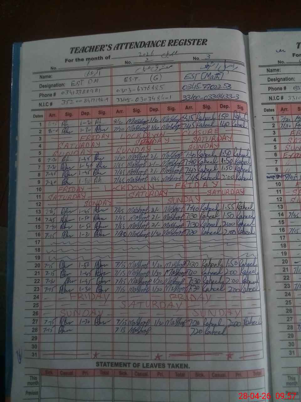| CNIC | Full Name | Designation | R/C | Absence During Last Calender Month |