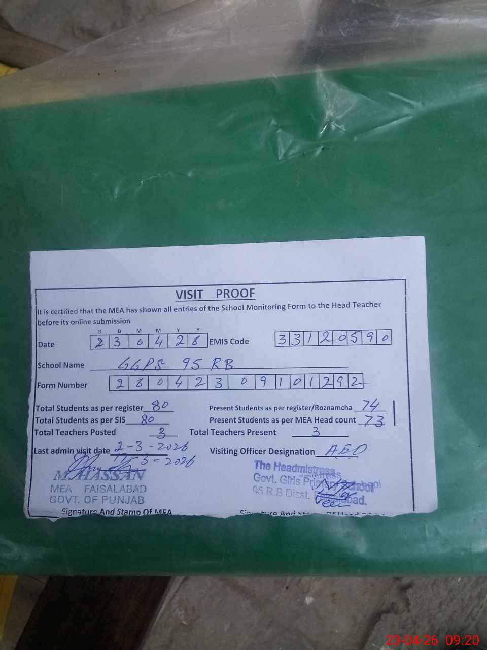 | EMIS Code: 33120590 | Name of School: GGPS CHAK 95 RB KHURRIANWALA | |||