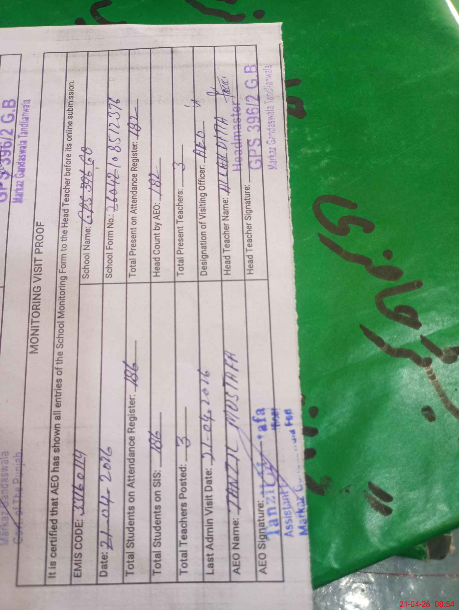 | EMIS Code: 33160114 | Name of School: GPS CHAK 396 GB TANDLIANWALA | |||